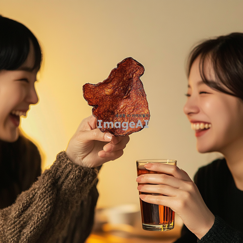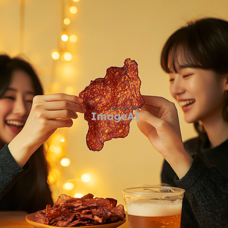 친구들과 함께 비프칩을 먹으며 즐거운 시간을 보내고 있는 성인들, 다양한 표정과 포즈로 웃고 있는 모습, 아늑한 분위기의 카페나 집 안, 테이블 위에 비프칩과 음료가 놓여 있는 장면, 따뜻한 조명 아래에서의 친목 모임, 한국적인 요소가 가미된 스타일.