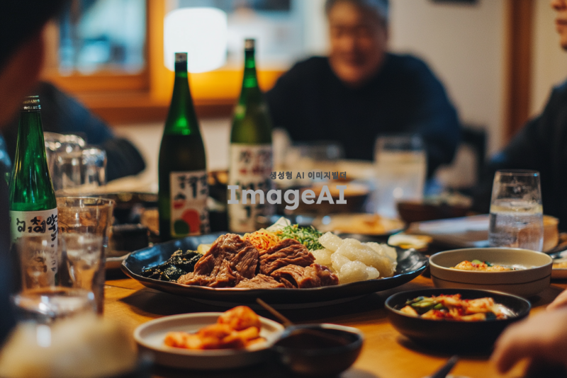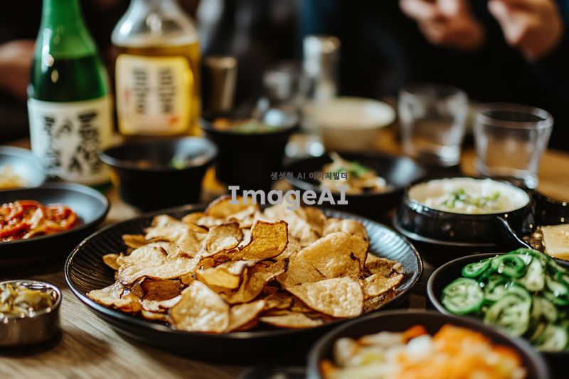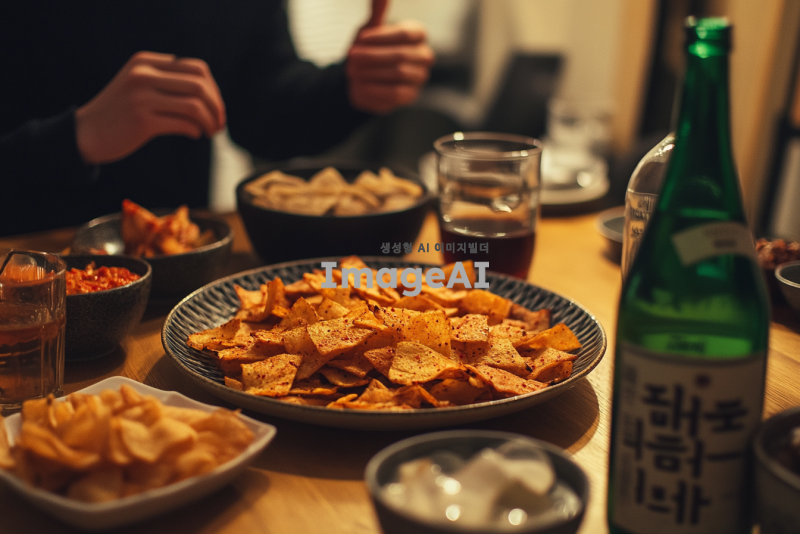 한국인 남성이 소고기칩을 즐기며 친구들과 함께 술안주로 나누는 장면. 따뜻한 조명 아래, 맛있게 구운 소고기칩이 담긴 접시와 함께 유쾌한 대화가 오가는 분위기. 배경에는 한국의 전통적인 소주병과 잔이 놓여있고, 테이블 위에는 다양한 안주가 함께 배열되어 있는 모습.