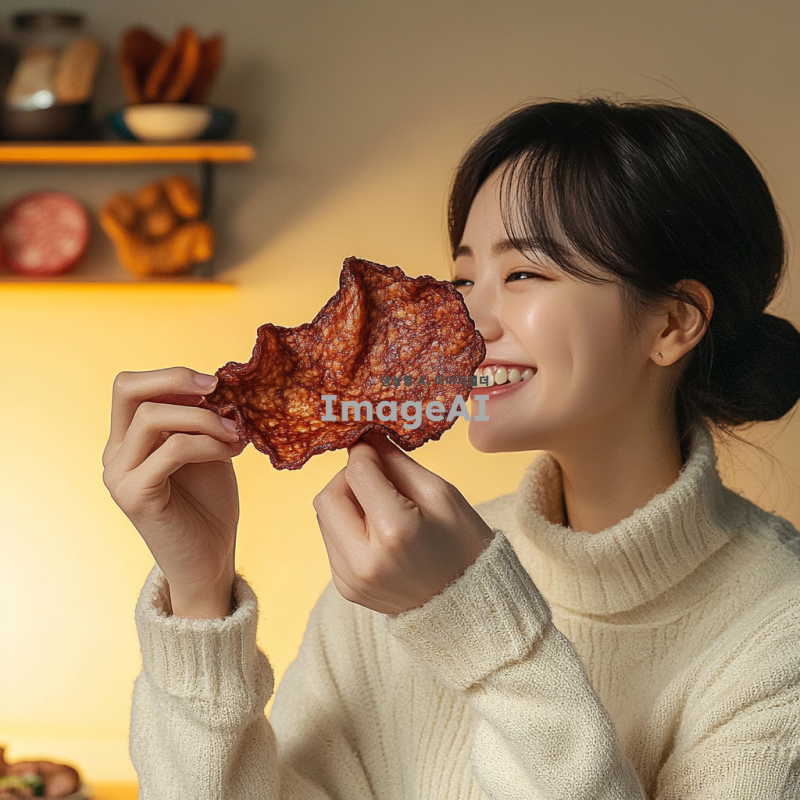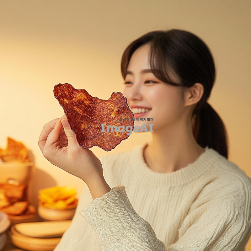 비프칩을 맛있게 먹고 있는 한국인 남성 여성, 편안한 분위기의 주방에서 웃으며 간식을 즐기는 모습, 배경에는 다양한 한국 간식들이 놓여 있고, 따뜻한 조명이 비추는 장면.