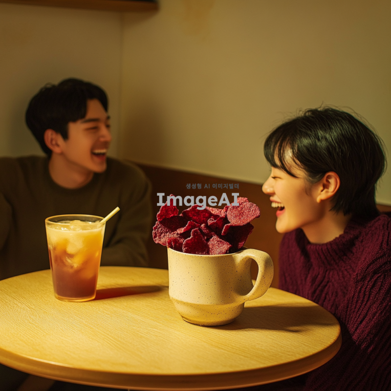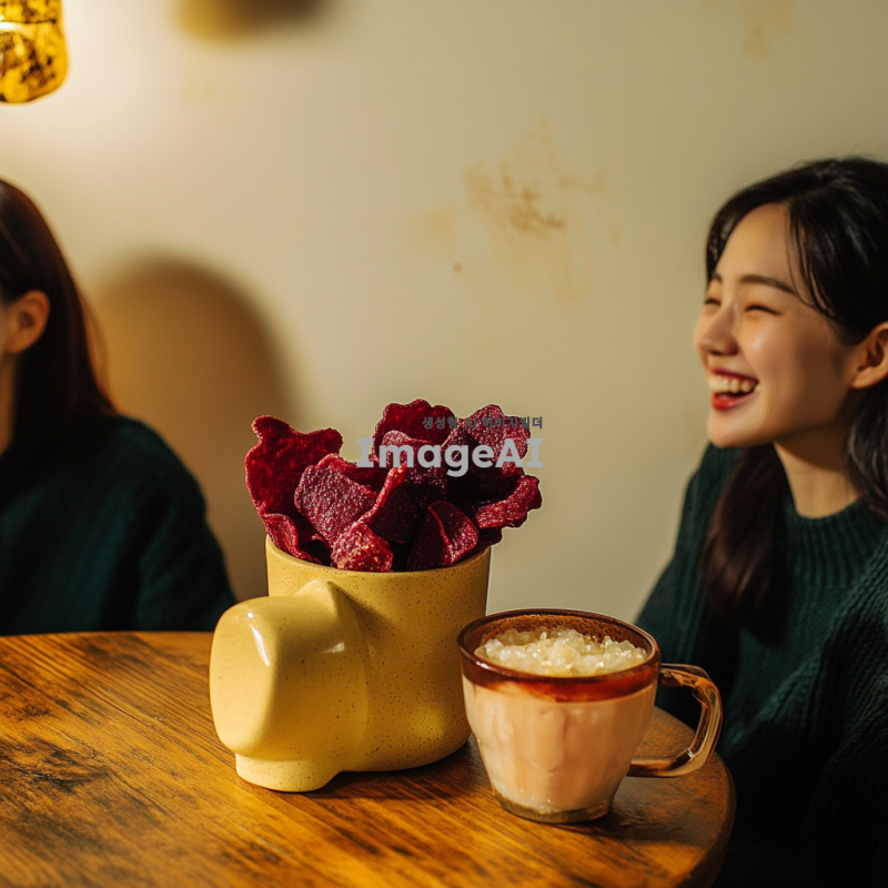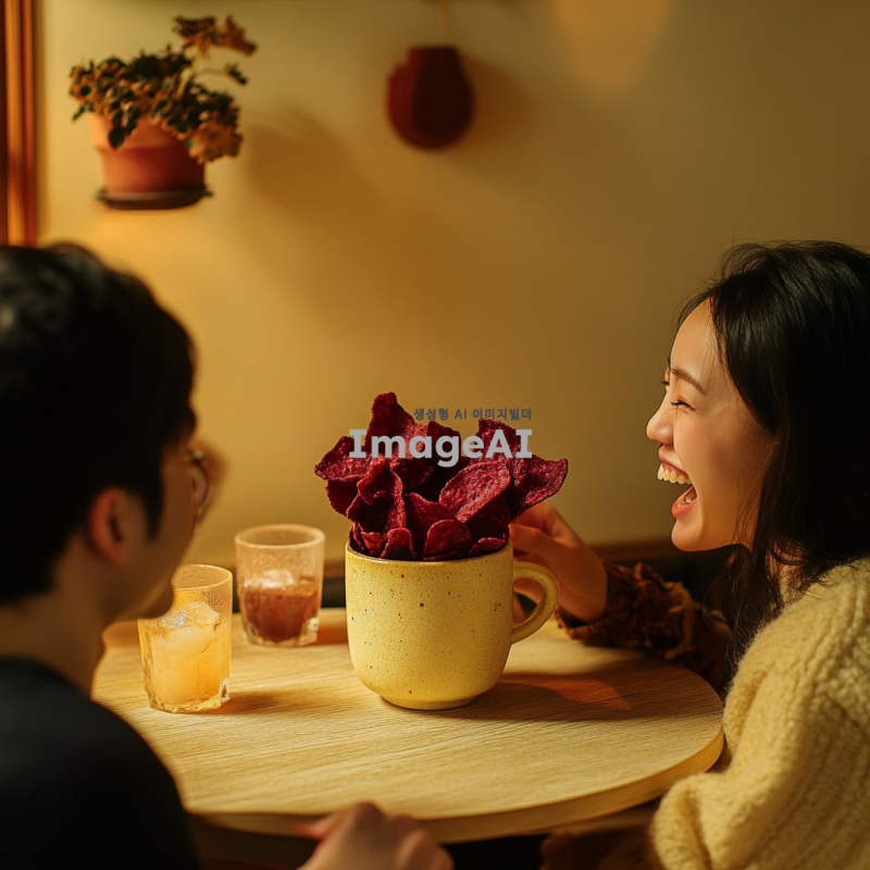 한국의 아늑한 카페에서 비프칩을 함께 나누며 웃고 있는 친구들, 다양한 표정과 포즈로 즐거운 시간을 보내고 있는 모습, 테이블 위에는 비프칩과 음료가 놓여 있고, 배경에는 따뜻한 조명이 비추는 아기자기한 인테리어, 한국의 전통적인 요소가 살짝 가미된 공간.