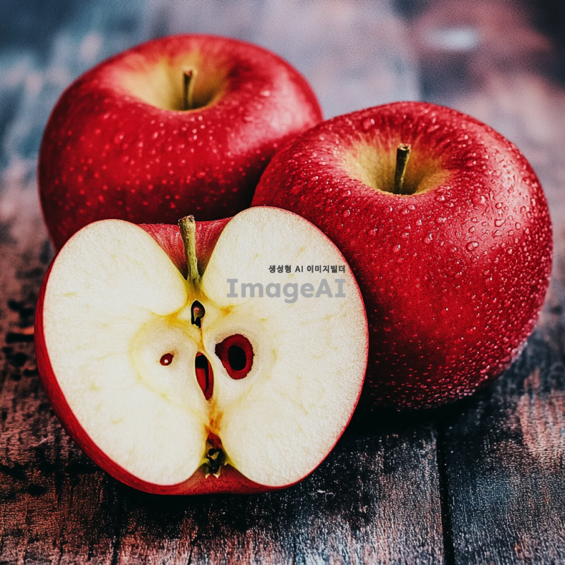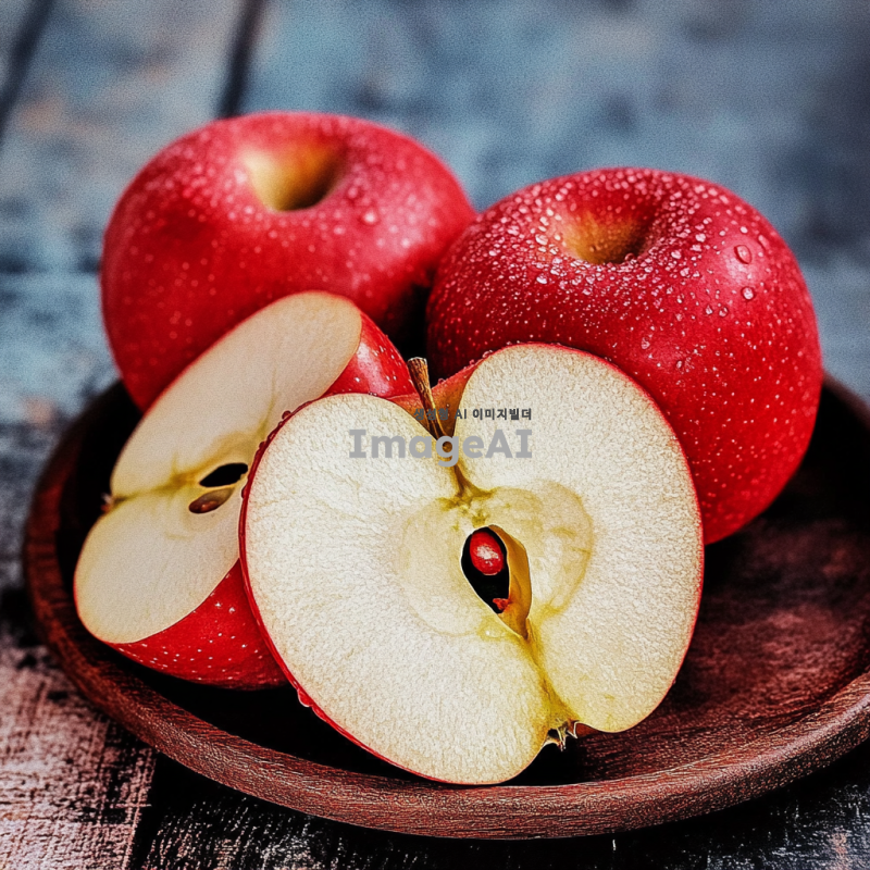 맛있어 보이는 반으로 쪼갠 사과, 신선한 사과의 붉은 색과 생생한 질감, 반으로 나누어진 사과의 내부가 드러나고, 반짝이는 물방울이 맺힌 모습, 자연광 아래에서 촬영된 느낌, 식욕을 자극하는 이미지