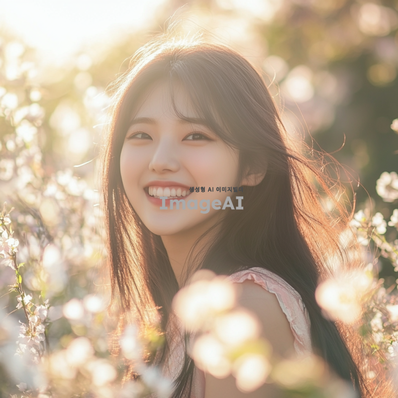 밝은 햇살 아래 공원에서 웃고 있는 한국인 여성, 긴 머리를 가진, 화사한 원피스를 입고, 주변에 꽃들이 만발한 모습, 자연스러운 표정과 따뜻한 분위기, 행복한 순간을 담은 이미지