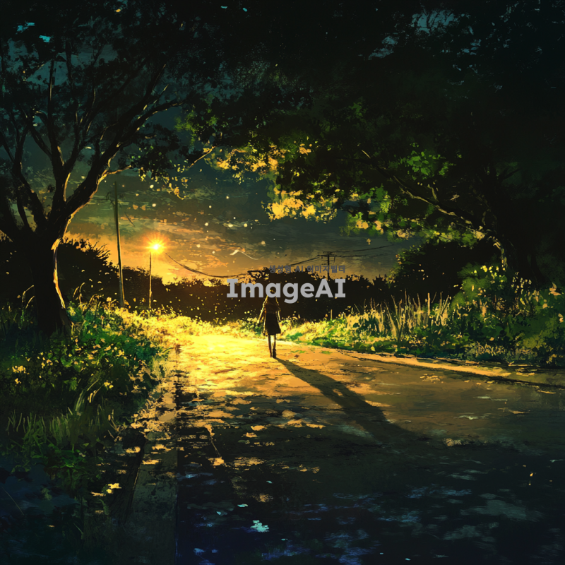 길 끝에서 밝은 빛이 비추고 있는 장면, 한 한국인이 그 빛을 향해 걸어가는 모습. 주변은 어두운 분위기지만, 빛나는 곳은 따뜻하고 희망적인 느낌을 주며, 사람의 표정은 결단력과 희망으로 가득 차 있다. 길은 자연으로 둘러싸여 있으며, 나무와 풀들이 빛을 반사하여 아름다운 풍경을 연출하고 있다.