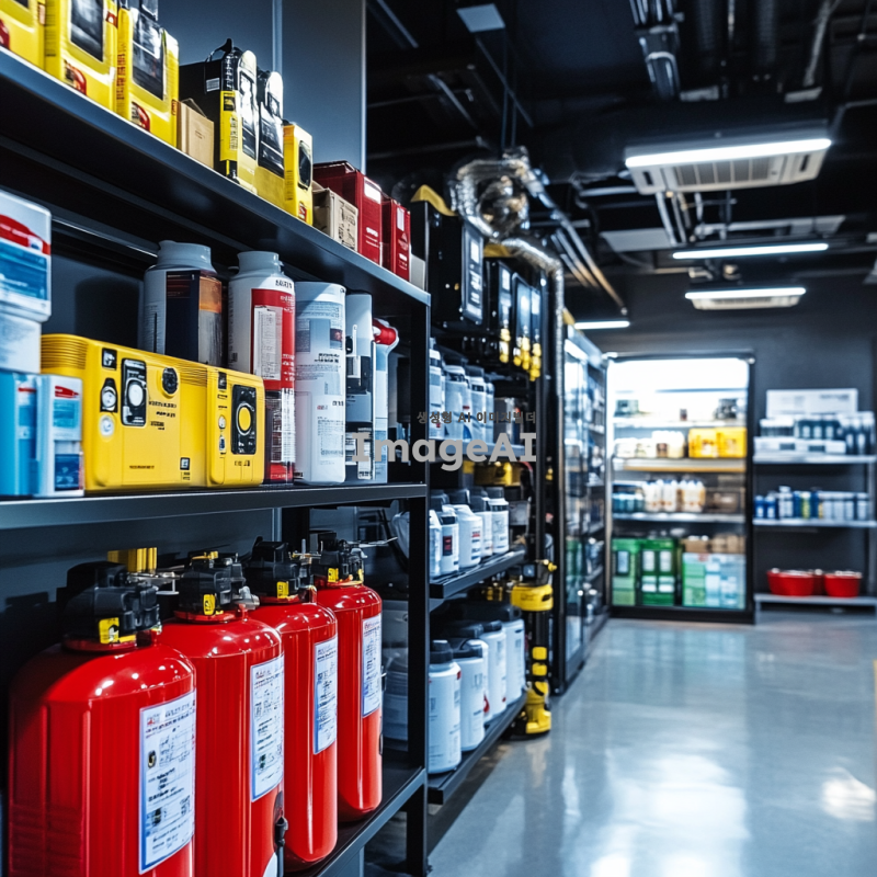소방 및 방재 전문 기업인 주식회사 창성에이스산업의 다양한 제품들을 배경으로 한 이미지. 반도체 장비용 자동 소화 시스템, 불꽃 감지기, 열영상 화재감지카메라, 주방용 소화기 등 여러 제품이 조화롭게 배열되어 있는 모습. 예술의 전당, 흥인지문, 불국사와 같은 주요 시설의 실내 또는 외부 환경을 배경으로 하여, 제품들이 실제로 설치된 듯한 느낌을 주는 장면. 한국인 엔지니어가 제품을 점검하거나 설명하는 모습이 포함되어 있으며, 안전하고 신뢰감 있는 분위기를 강조.