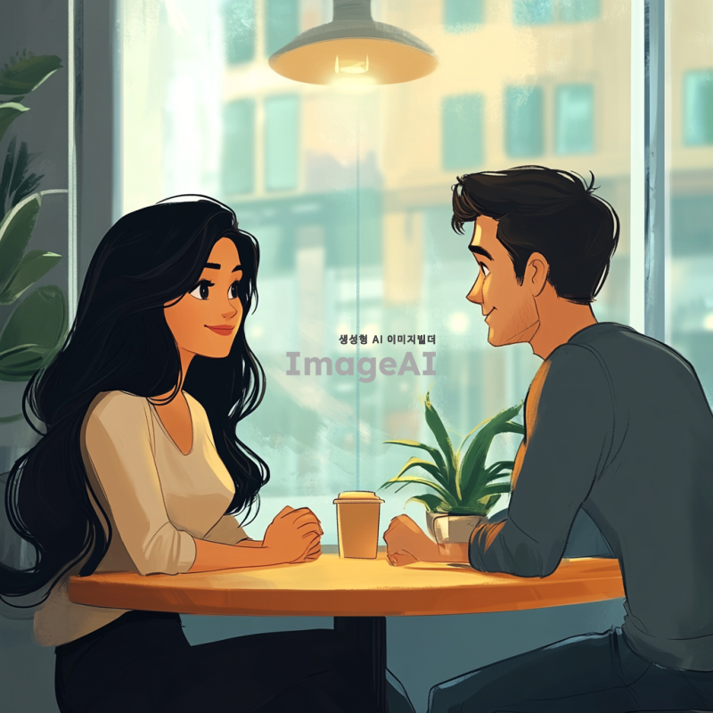 검은 물결 머리를 가진 여성 캐릭터가 커피숍의 테이블에 앉아 남성 캐릭터와 만나는 모습을 담은 만화 스타일의 애니메이션 일러스트. 배경은 최대한 차분하게 표현하여 전체적인 분위기를 부드럽고 아늑하게 연출.