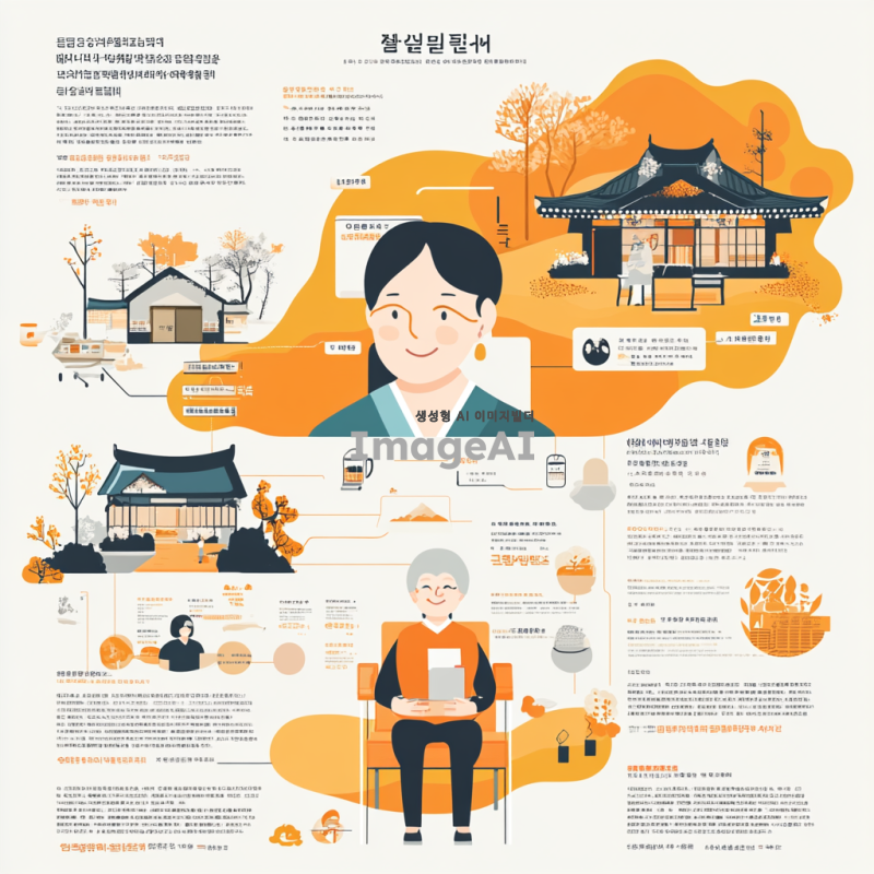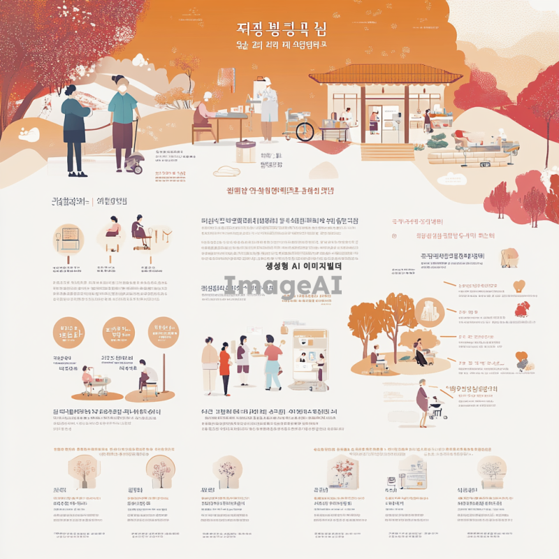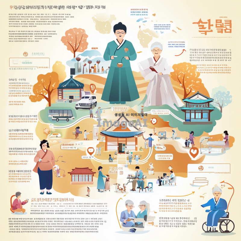 한국의 간병비 보험 보장 내역을 설명하는 인포그래픽 디자인, 간병인을 돕는 모습과 다양한 보장 항목들을 시각적으로 나타낸 이미지, 따뜻한 색감과 친근한 스타일, 한국의 전통적인 요소를 가미한 배경, 간병 서비스의 중요성과 혜택을 강조하는 메시지 포함.