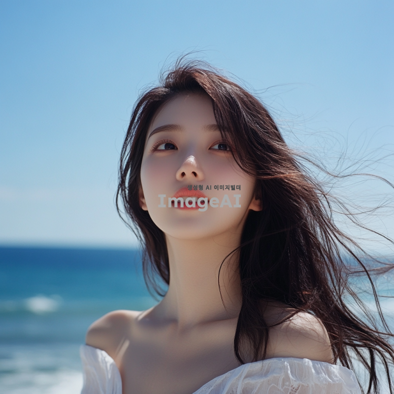 대한민국 출신 여성, 자연스러운 표정, 해변에서 여유롭게 시간을 보내는 모습, 부드러운 머리카락, 따뜻한 햇살 아래에서 빛나는 피부, 배경은 푸른 바다와 하늘, 여름의 기분을 느낄 수 있는 장면