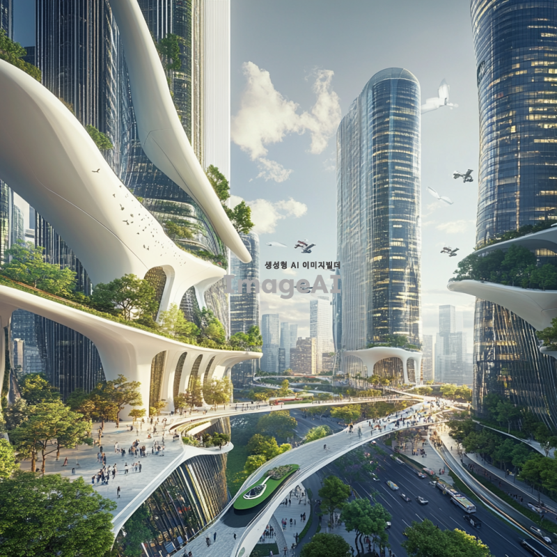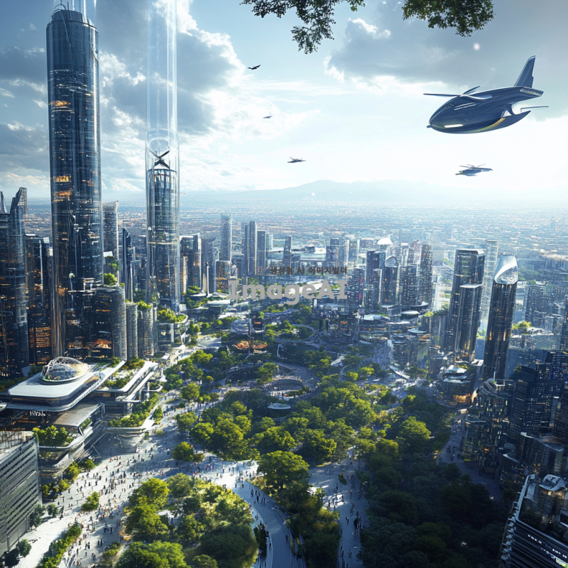 미래의 세계도시 풍경, 첨단 기술이 적용된 스마트 시티, 공중에 떠 있는 교통 수단과 녹지 공간이 조화롭게 어우러진 모습, 고층 빌딩과 자연이 공존하는 환경, 다양한 문화와 사람들이 함께하는 활기찬 거리 풍경, 미래적이고 혁신적인 건축물과 조명, 맑은 하늘과 푸른 공원, 미래 지향적인 디자인 요소가 가미된 도시 전경.