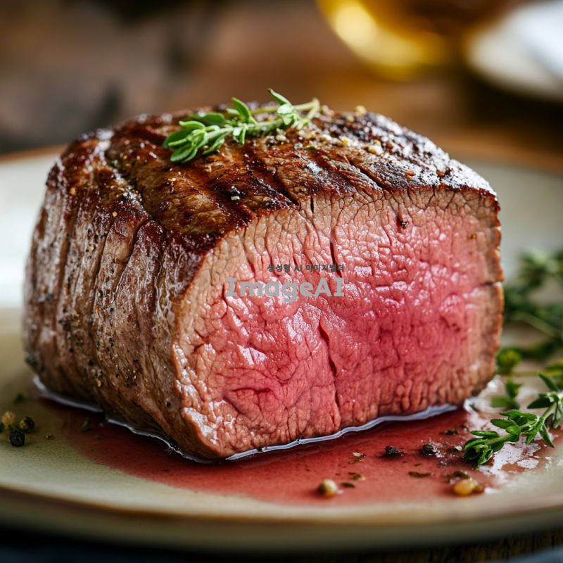 부드럽고 육즙이 가득한 소고기 안심 스테이크, 겉은 바삭하게 구워지고 속은 핑크색으로 완벽하게 익힌 모습, 신선한 허브와 함께 플레이팅된 고급스러운 요리, 고급 레스토랑의 분위기, 세련된 접시와 함께 제공되는 모습, 따뜻한 조명 아래에서의 식사 장면.