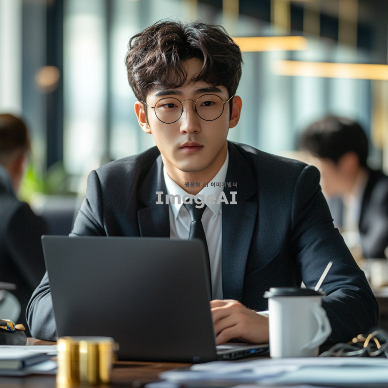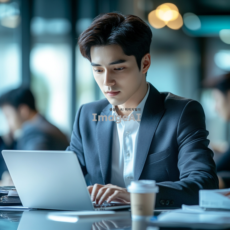 한국의 사무실 환경에서 일하는 젊은 회사원, 정장 차림에 노트북 앞에 앉아 집중하고 있는 모습, 주변에는 동료들이 있는 사무실 풍경, 자연광이 들어오는 창가, 현대적인 사무실 인테리어, 편안한 분위기, 진지한 표정, 다양한 서류와 커피 컵이 있는 책상 위 모습.