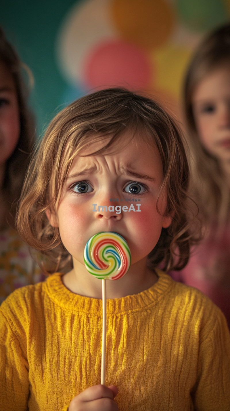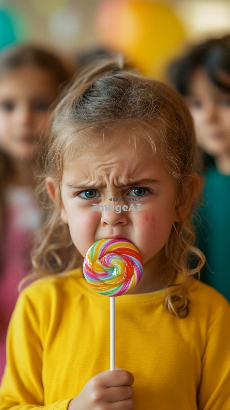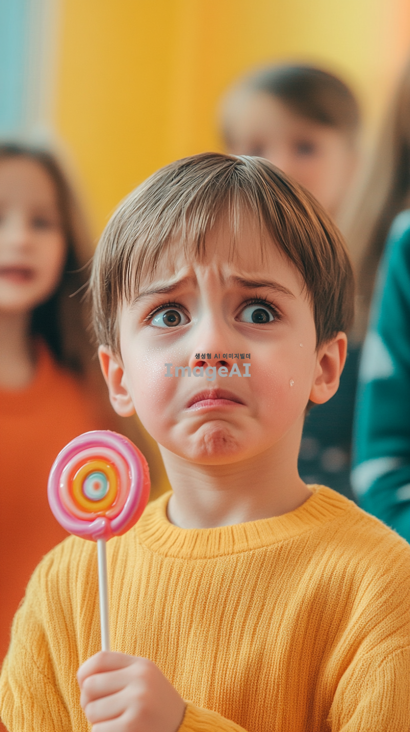 어린아이가 막대사탕을 들고 두 눈에 눈물을 글썽이며 겁에 질린 모습, 주변에는 친구들이 장난스럽게 다가오는 모습, 아동용 밝은 색상의 배경, 감정이 잘 드러나는 얼굴 표정, 따뜻하고 아기자기한 분위기