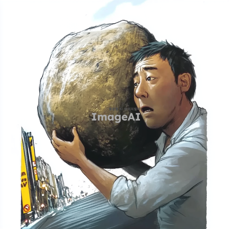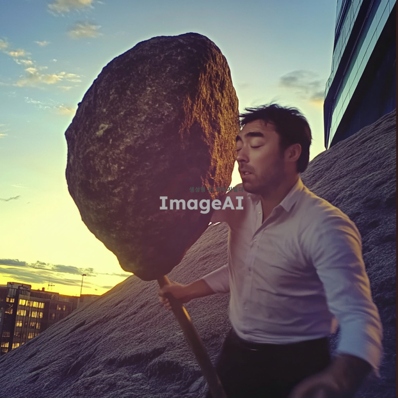 큰 바위를 언덕 위로 밀어 올리는 사람, 무게와 싸우며 이마에 땀이 번들거리는 이미지 만들어줘