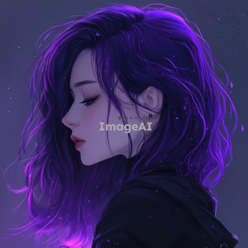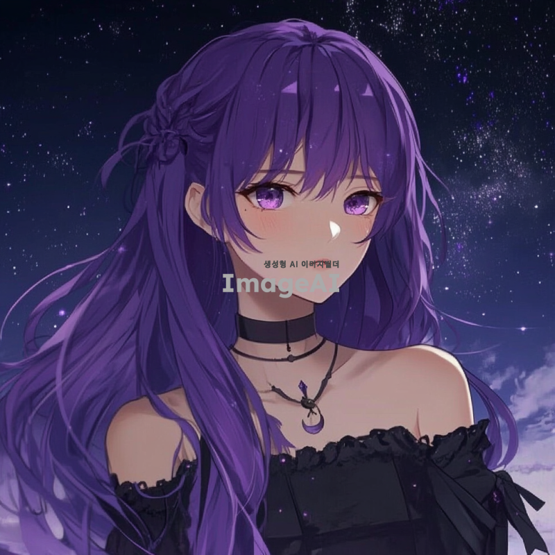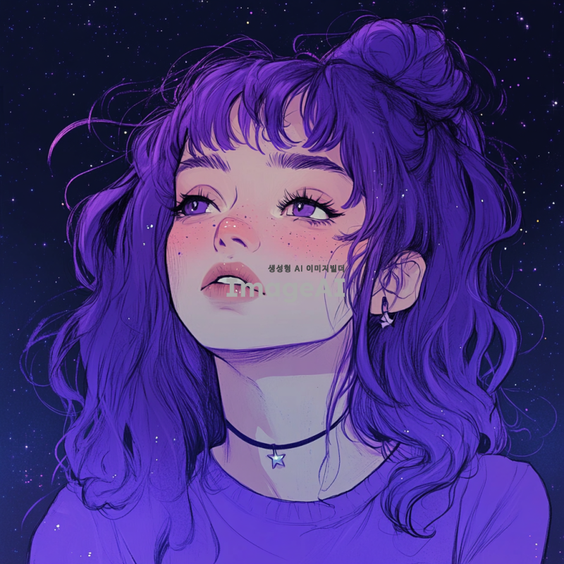 머리카락: 보라색 머리에 은은하게 별빛이 반짝이는 느낌을 주는 효과를 넣어 보세요. 예를 들어, 머리카락 끝에 은색이나 금색 하이라이트를 넣어 별이나 은하수를 연상시키는 디테일을 추가할 수 있습니다.