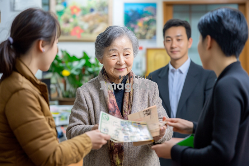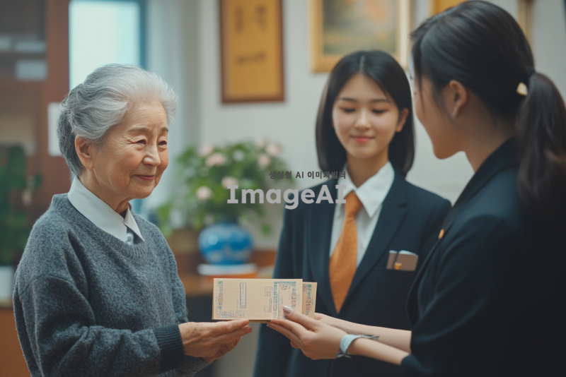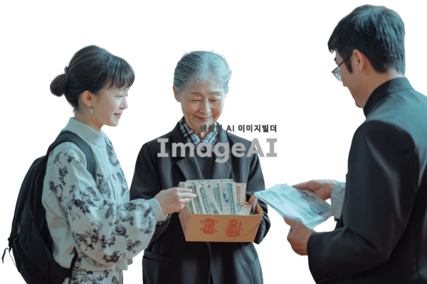 인자하고 포근한 표정의 60대 한국인 할머니가 현금이 든 봉투를 교복을 입은 학생에게 기부하는 모습. 배경은 그림과 화분이 있는 우아한 사무실이며, 주변에는 여교장 1명과 남자 목사 1명이 온화하게 웃으며 이들을 바라보고 있는 장면.