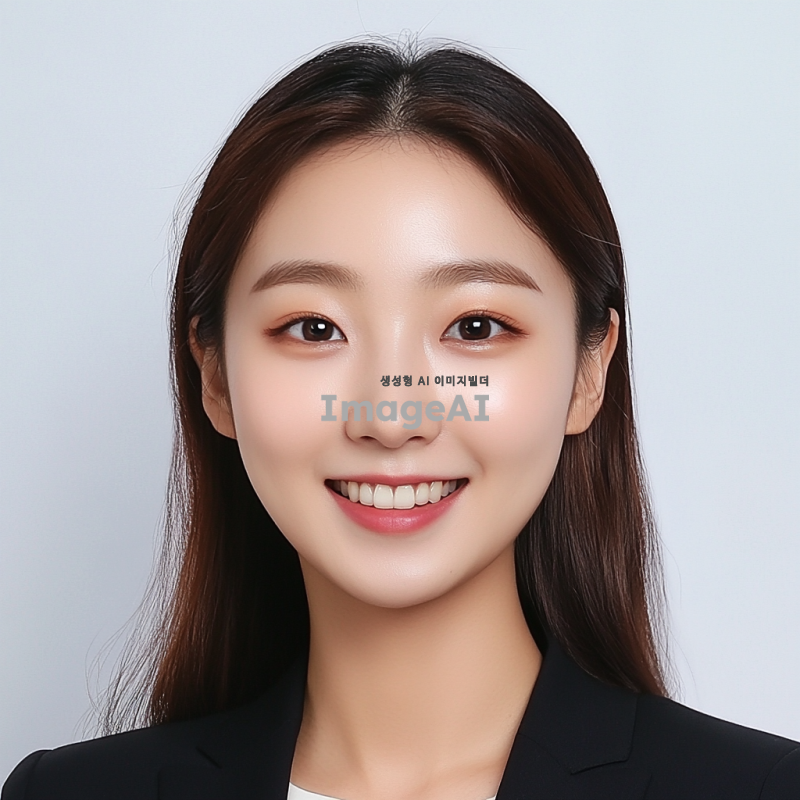 밝고 자연스러운 조명 아래에서 미소를 짓고 있는 한국 여성의 증명사진, 깔끔한 배경, 정장 차림, 단정한 헤어스타일, 부드러운 피부톤, 눈에 띄는 자연스러운 메이크업, 상반신이 보이는 구도.