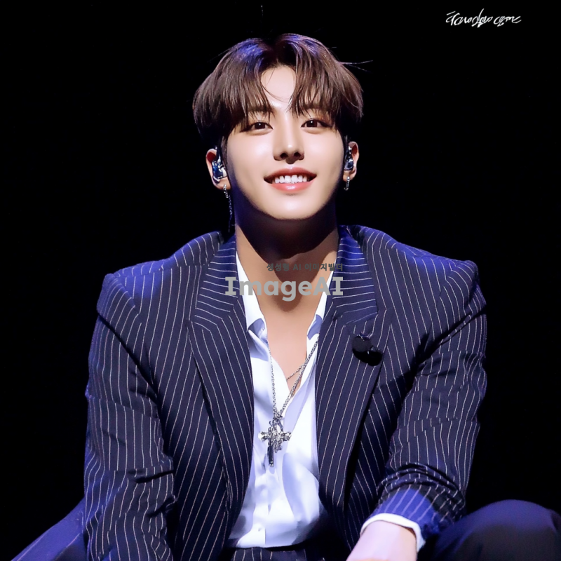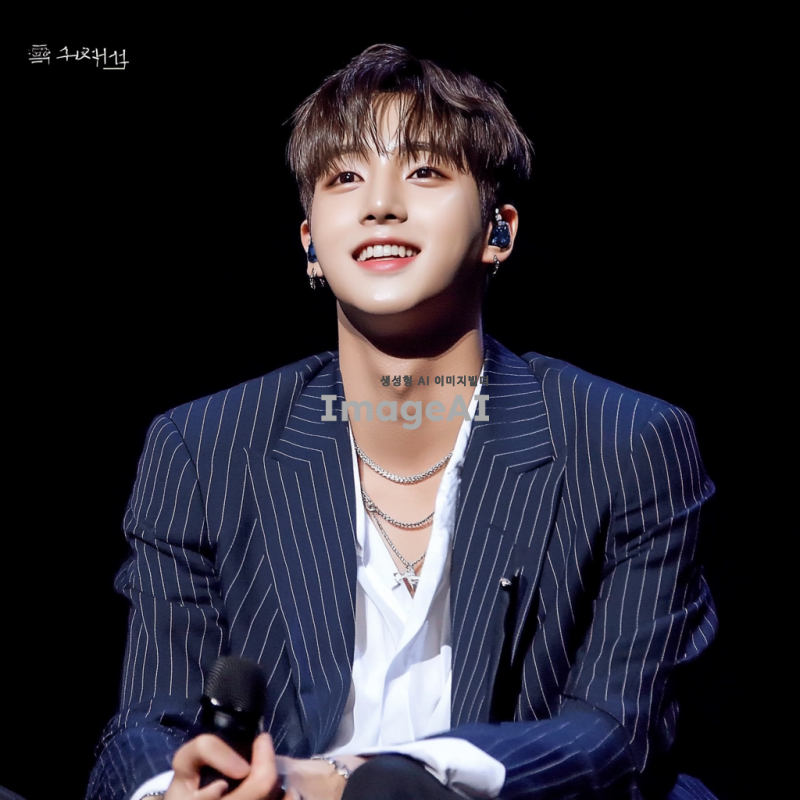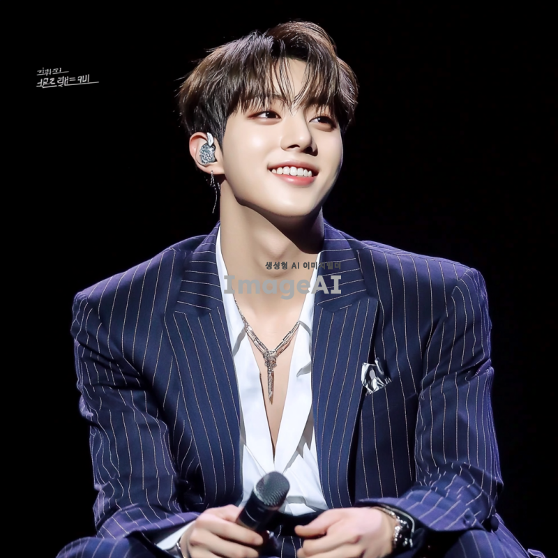 20세 남성, 짧은 머리와 약간 내려온 앞머리, 직선적인 갈색 눈을 가진 모습. 그는 네이비 블루 줄무늬 수트 재킷 안에 흰 셔츠를 입고, 허리에 검은 블레이저를 걸치고 있으며, 목에는 은색 목걸이를 하고 있다. 그는 무대에 앉아 마이크를 들고 웃고 있다. 스타일은 K-pop 아이돌의 것이다. 고품질의 사진 촬영으로 검은 배경이 있다.