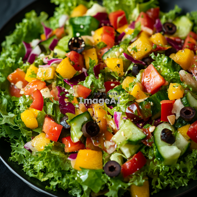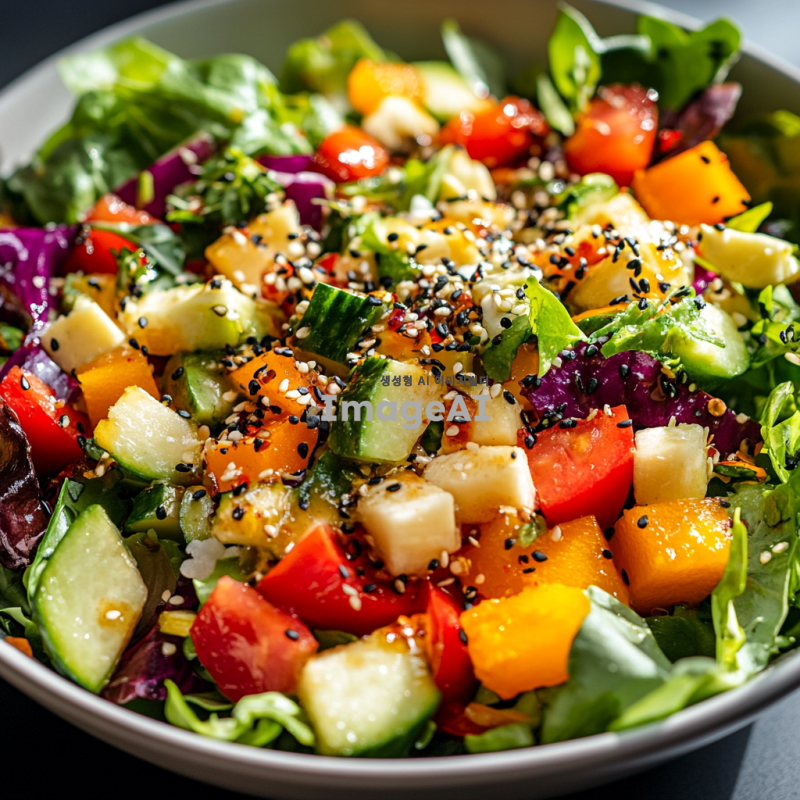 신선한 채소와 과일이 가득 담긴 싱그러운 샐러드, 다양한 색상의 채소가 어우러져 있는 모습, 아삭한 식감이 느껴지는 상큼한 드레싱이 뿌려진, 자연광 아래에서 촬영된, 건강하고 맛있어 보이는 느낌