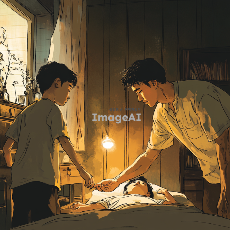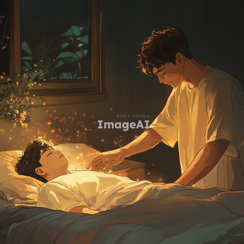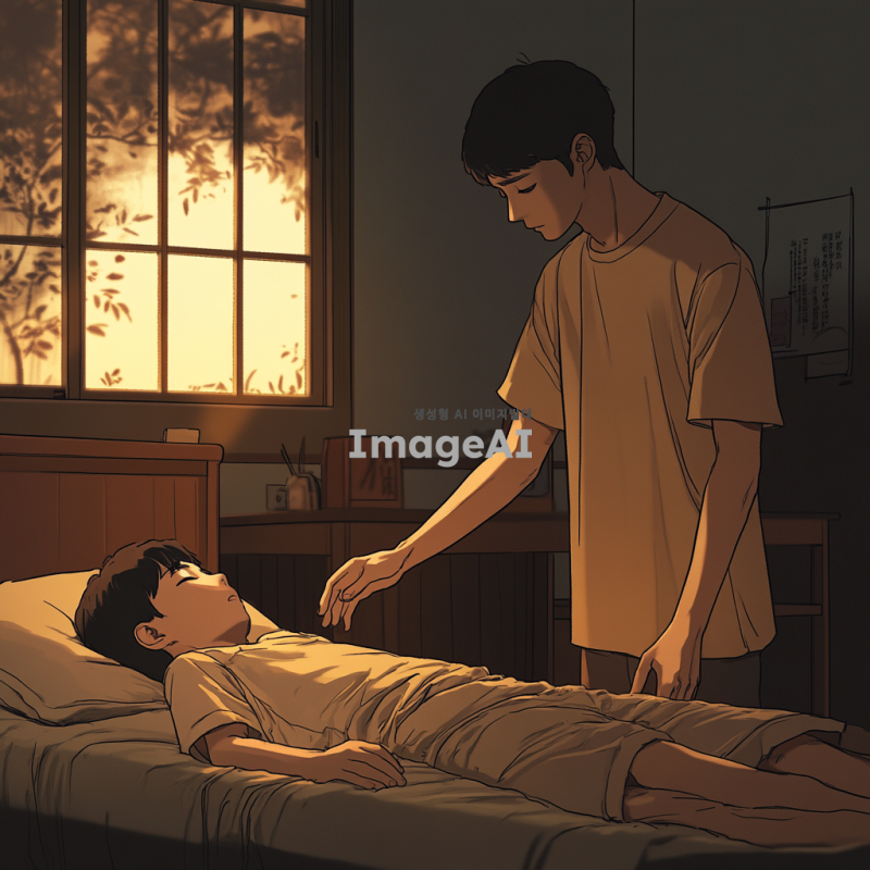 한적한 방 안, 누워 있는 소년 위로 다가오는 남자의 모습. 남자는 짧은 머리를 가진 한국인으로, 소년을 보호하려는 듯한 표정. 방 안은 따뜻한 조명이 비추고, 소년은 편안한 표정으로 누워 있음. 남자는 소년에게 다가가며 손을 내밀고, 두 사람 사이에는 신뢰와 우정이 느껴지는 분위기.