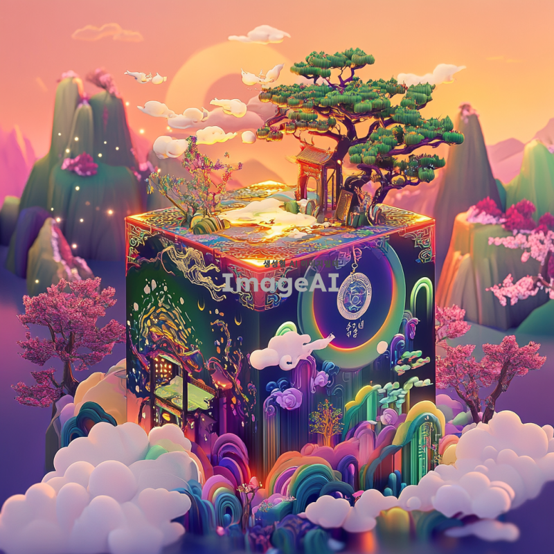 정육면체 형태의 도깨비방망이를 디자인한 이미지, 한국 전통 문화의 요소를 포함하여 화려한 색상과 독특한 패턴을 강조, 배경은 몽환적인 느낌의 자연 풍경으로 설정, 도깨비방망이는 빛나는 효과를 주어 마법적인 느낌을 추가.