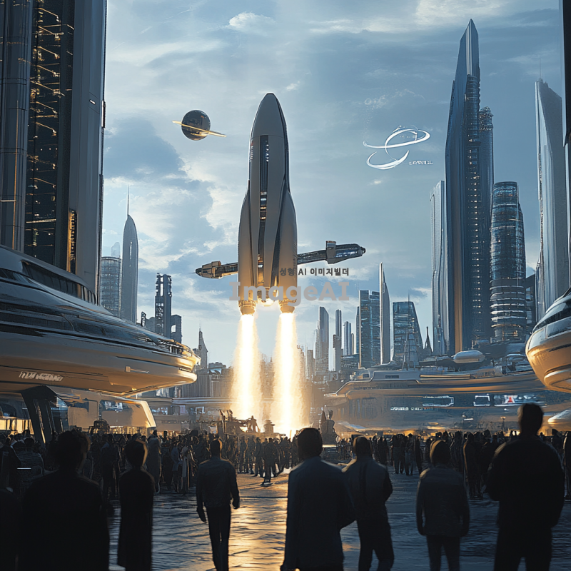 우주기업의 발전으로 인해 변화하는 일상 생활을 주제로 한 이미지. 현대적인 도시 풍경 속에 우주선이 이착륙하는 모습, 사람들은 우주 여행을 준비하며 신기한 기술을 사용하고 있는 장면. 다양한 인종의 사람들이 함께 모여 우주 관련 이벤트에 참여하고, 우주 기업의 로고가 보이는 배경. 미래적이고 혁신적인 분위기를 강조하며, 우주와 관련된 다양한 요소들이 조화를 이루는 모습.