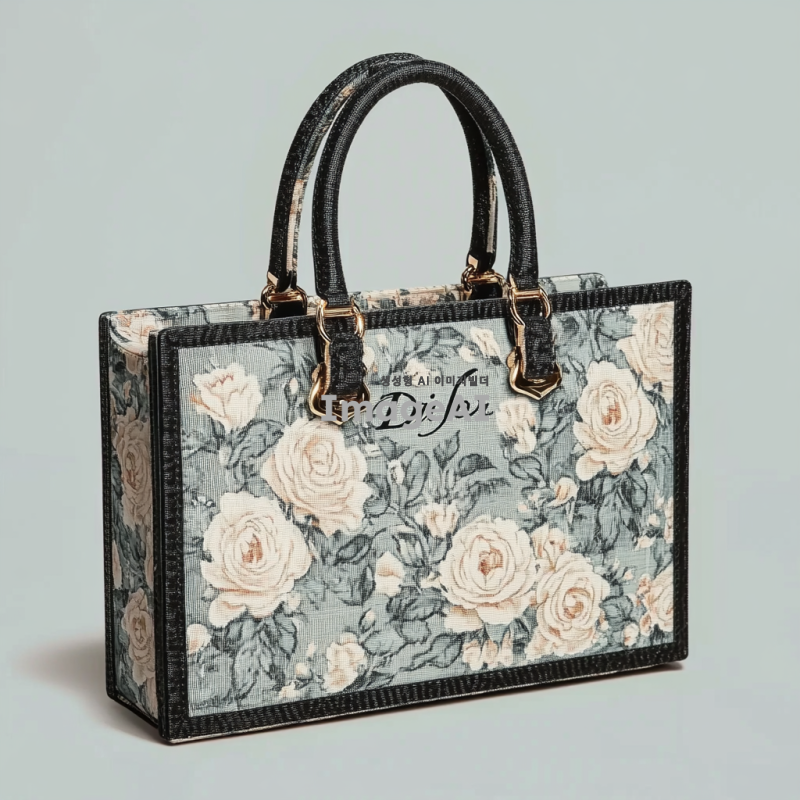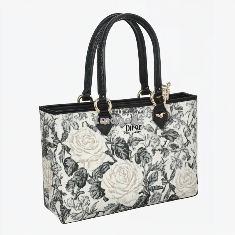 디올과 샤넬이 협업하여 만든 가방 디자인을 만들거야. 디올의 토일 드 주이 패턴을 사용하고 샤넬의 테두리가 검정인 흰색 장미를 사용해서 봄의 분위기를 보여주는 가방을 제작 할거야. 가방의 원형은 디올의 북 토트로 해야해.