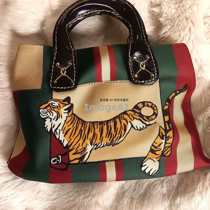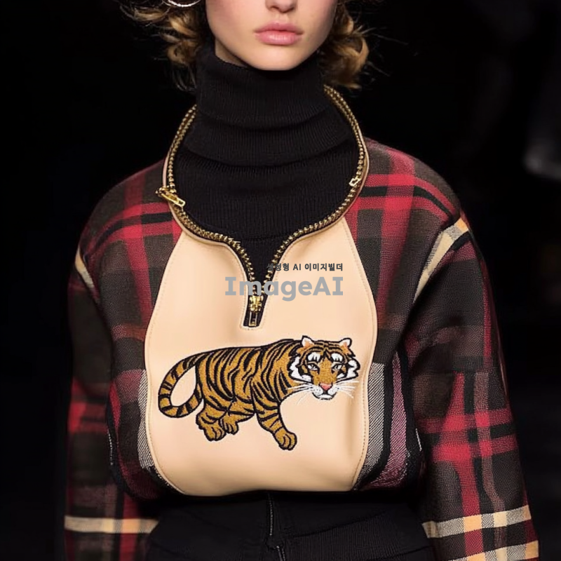 버버리의 패턴을 토대로 구찌의 대표 동물인 호랑이 자수와 대표 색상을 포인트로 넣어 버버리의 1960년대의 빈티지함과 현대의 세련됨과 트랜디함을 강조하여 사실적이고 실제로 판매되는 것처럼 만들어줘