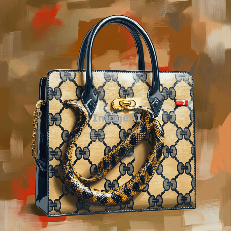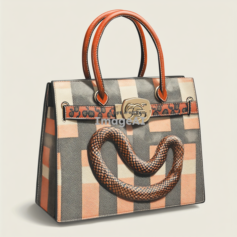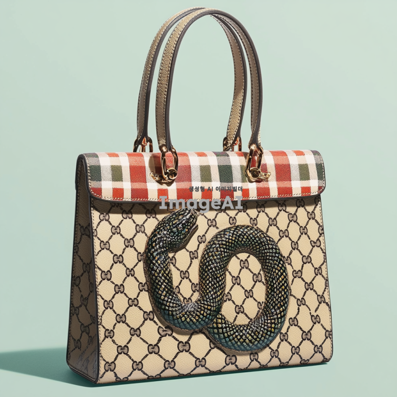 구찌 패턴의 뱀이 중앙에 배치된 핸드백 디자인, 배경에는 버버리의 체크 무늬가 조화롭게 어우러진 모습. 사실적이고 세련된 스타일로, 실제 판매되는 제품처럼 고급스러운 느낌을 강조. 구찌와 버버리의 브랜드 아이덴티티가 잘 드러나도록 섬세한 디테일을 포함.