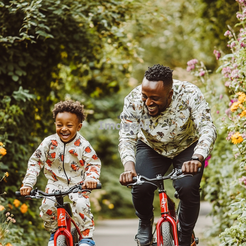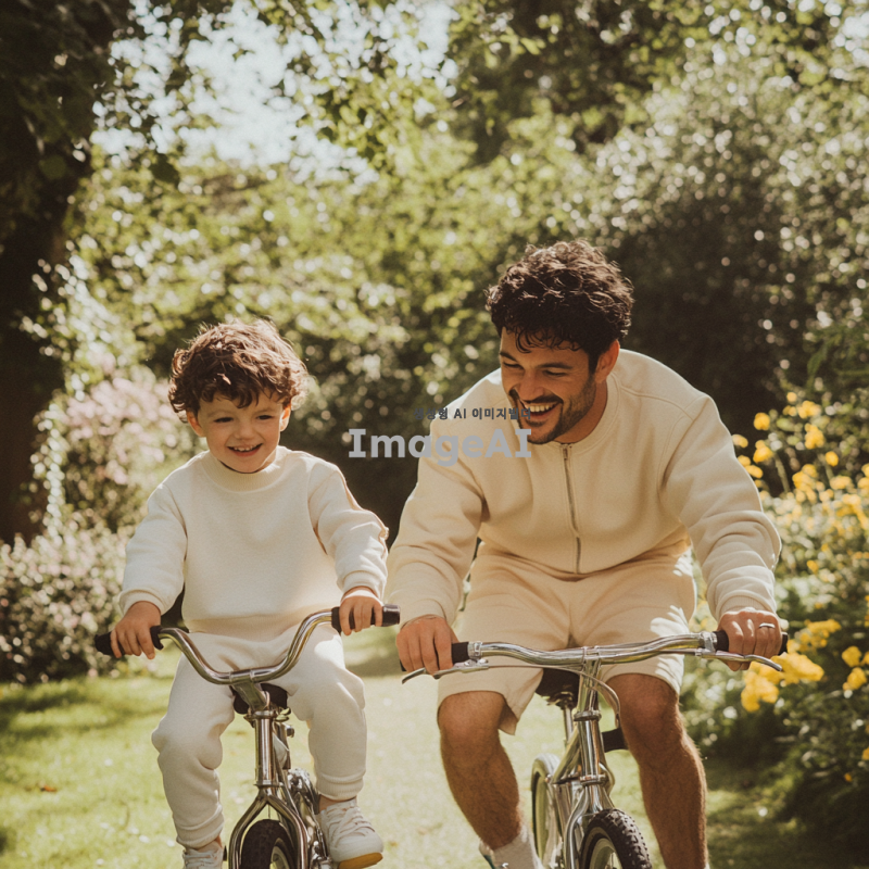 아빠와 아들이 함께 놀고 있는 모습, 공원에서 자전거를 타고 있는 장면, 따뜻한 햇살 아래 웃고 있는 모습, 아빠는 캐주얼한 옷을 입고 있고 아들은 귀여운 운동복을 입고 있음, 배경에는 푸른 나무와 꽃들이 있는 풍경, 행복한 가족의 순간을 포착한 이미지.