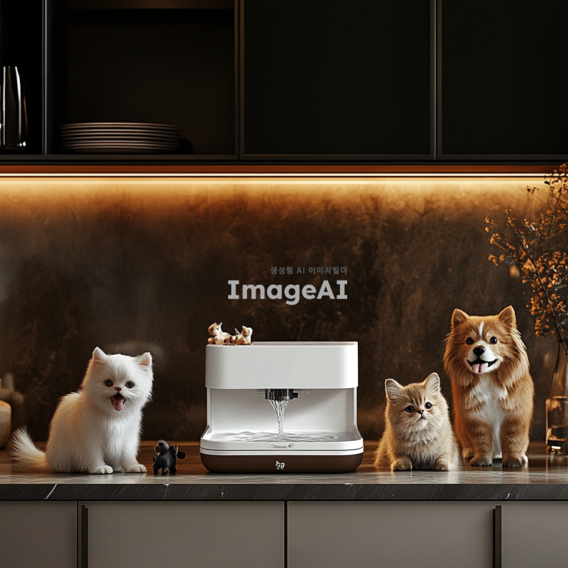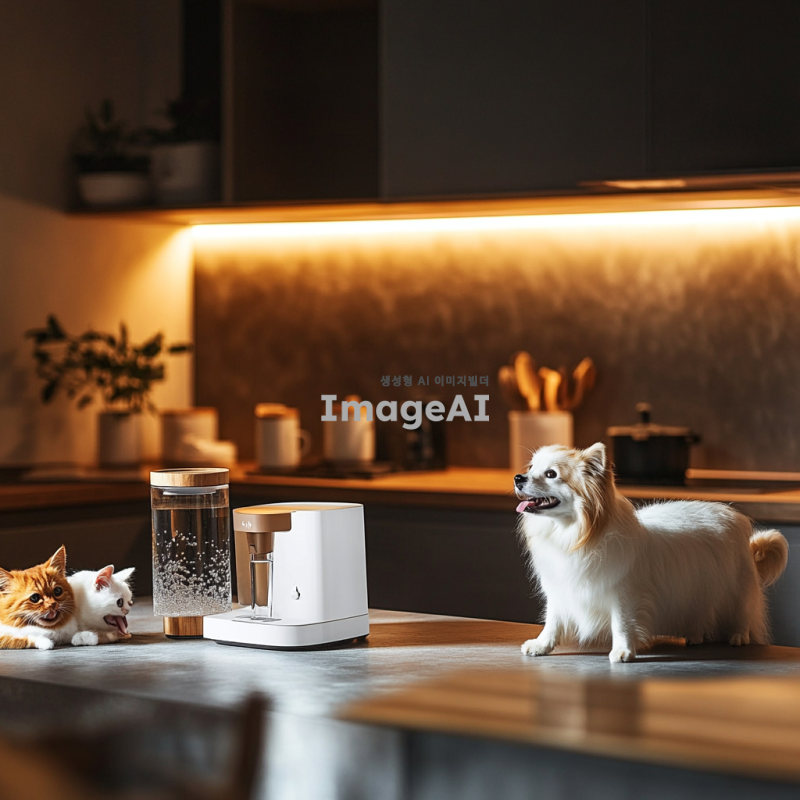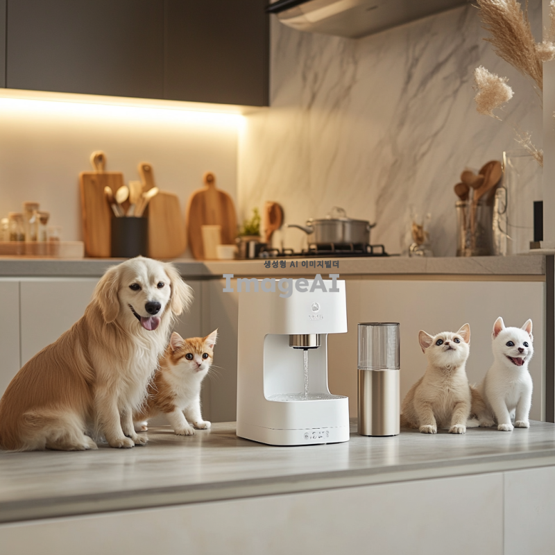 애완동물을 위한 초음파 감지 급수기가 있는 현대적인 주방 환경, 세련된 디자인의 급수기에서 물이 흐르고 있는 모습, 주변에 행복하게 노는 강아지와 고양이, 따뜻한 조명 아래 아늑한 분위기, 깨끗하고 정돈된 주방,