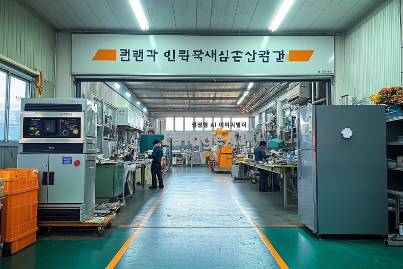 냉장고 장 리폼 공장 내부의 모습, 다양한 냉장고 모델들이 작업대에 놓여져 있고, 기술자들이 세심하게 작업을 하고 있는 장면, 현대적인 기계와 도구들이 배치된 작업 공간, 밝고 깔끔한 분위기, 효율적으로 진행되는 작업 프로세스, 한국의 전통적인 디자인 요소가 가미된 냉장고 리폼의 모습, 자연광이 들어오는 창문이 있는 공장 내부