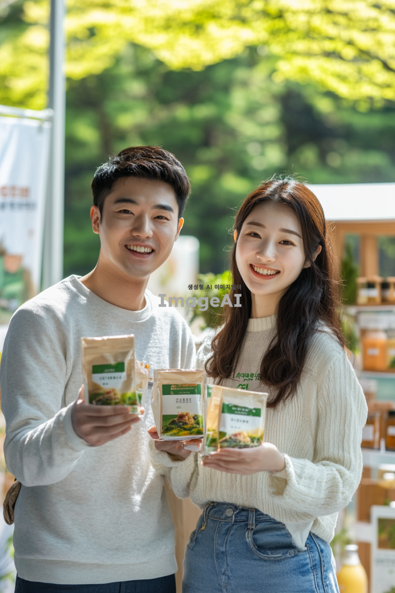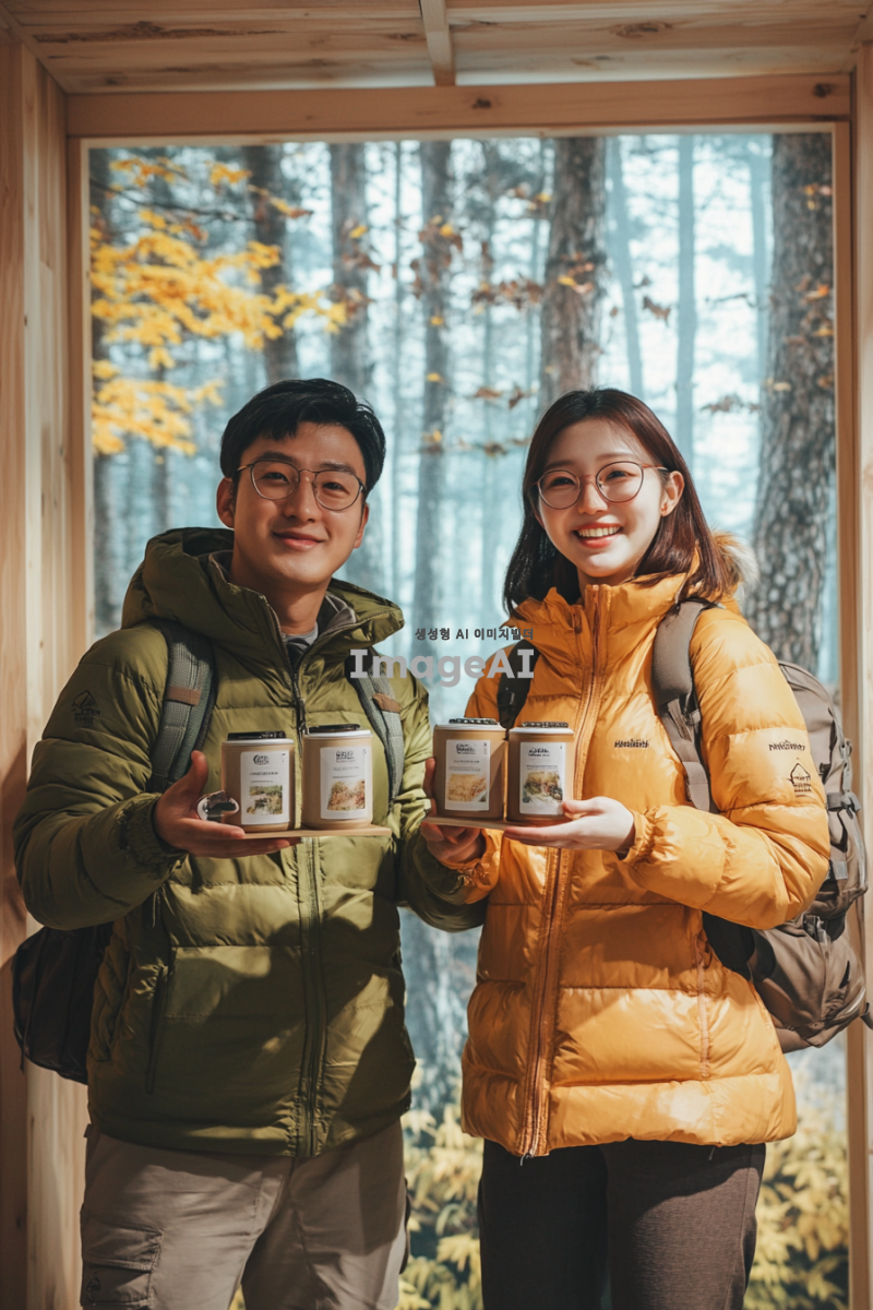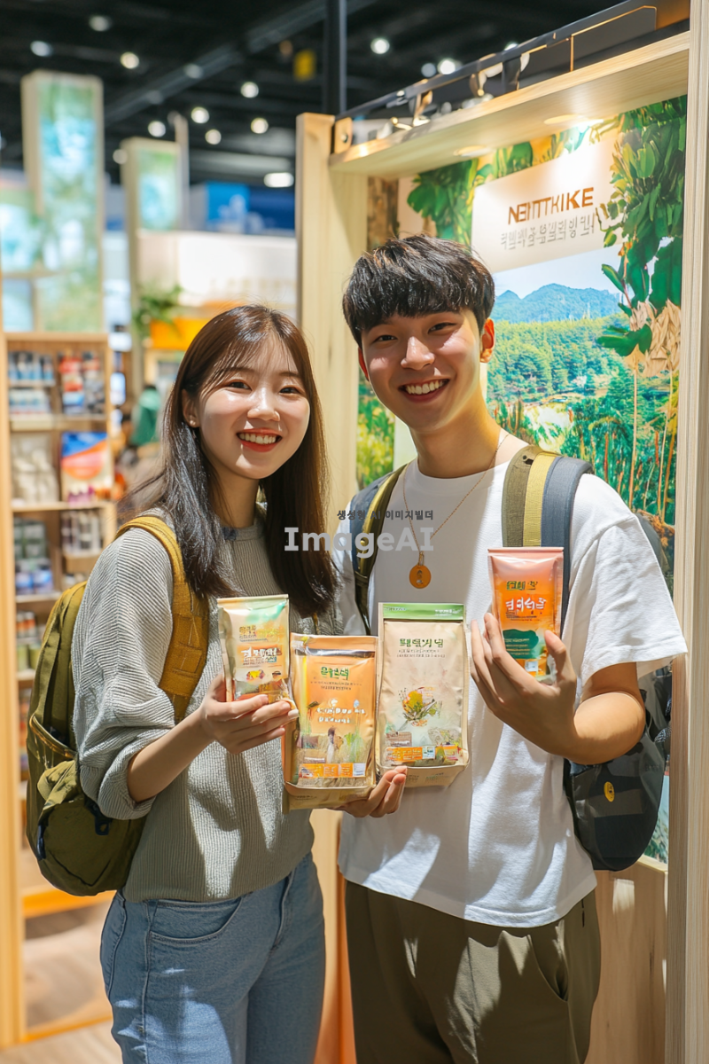 네이처하이크 부스에서 인증샷을 찍고 있는 한국인 남성과 여성의 모습. 다양한 네이처하이크 제품들이 배치된 부스 배경. 제품을 손에 들고 환하게 웃으며 사진을 찍는 모습. 부스의 디자인은 자연을 테마로 하고, 아늑하고 따뜻한 느낌을 주는 색감으로 표현. 주변에는 자연 경관이 보이는 창문이 있어 자연과의 조화를 강조. 인증샷을 찍는 즐거운 분위기와 함께, 네이처하이크 로고와 제품이 잘 보이도록 구성.