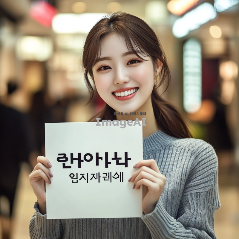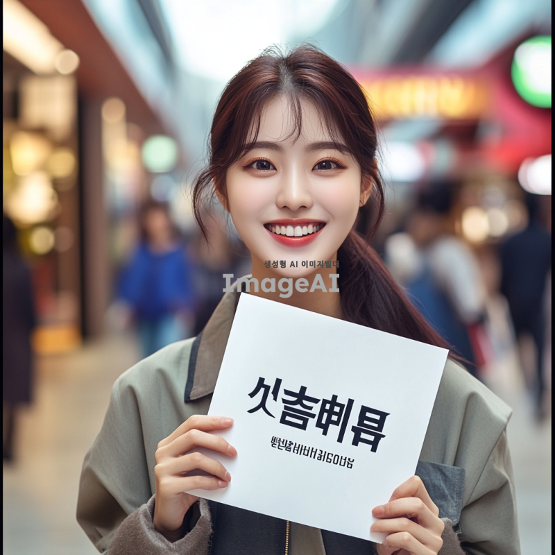 아름답게 미소 짓고 있는 한국 여성, 검은 글씨로 한글로"구강특허유산균"이라고 적힌 흰색 표지를 들고 있는 모습, 쇼핑몰 배경. 자연광이 고해상도이고 세밀한 이미지를 만들어줘