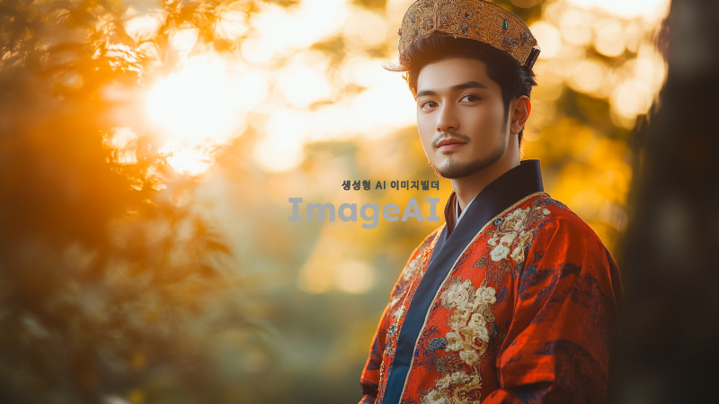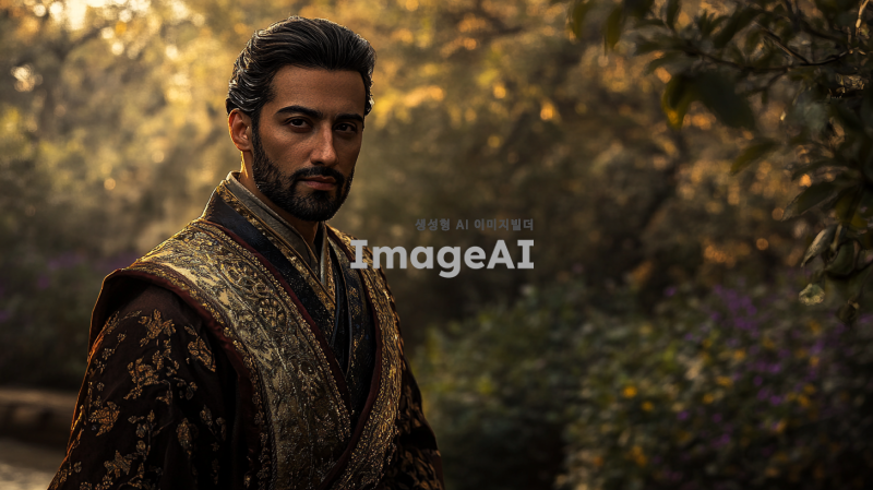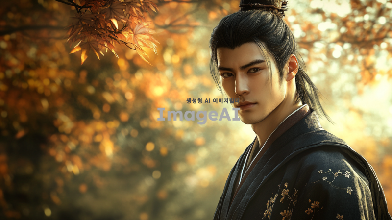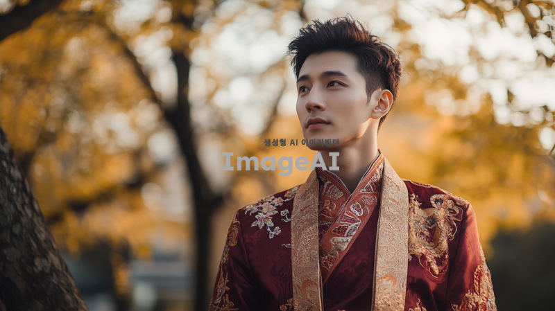 동양풍의 남성, 전통 의상을 입고 있는 모습, 세련된 헤어스타일, 자연 배경 속에서 여유롭게 서 있는 모습, 부드러운 조명, 따뜻한 색감, 문화적인 요소가 담긴 장식들, 고전적인 매력을 지닌 인물
