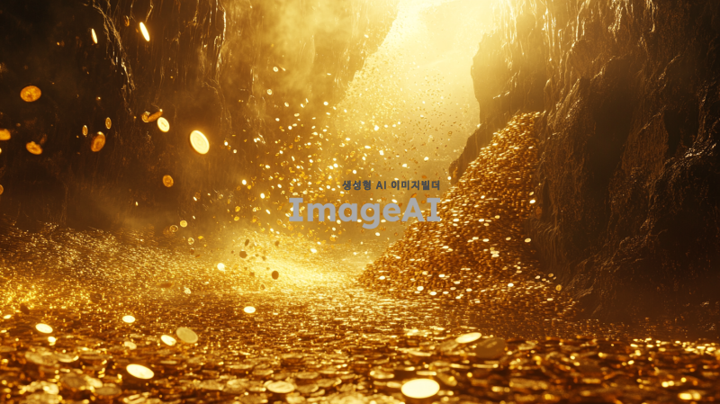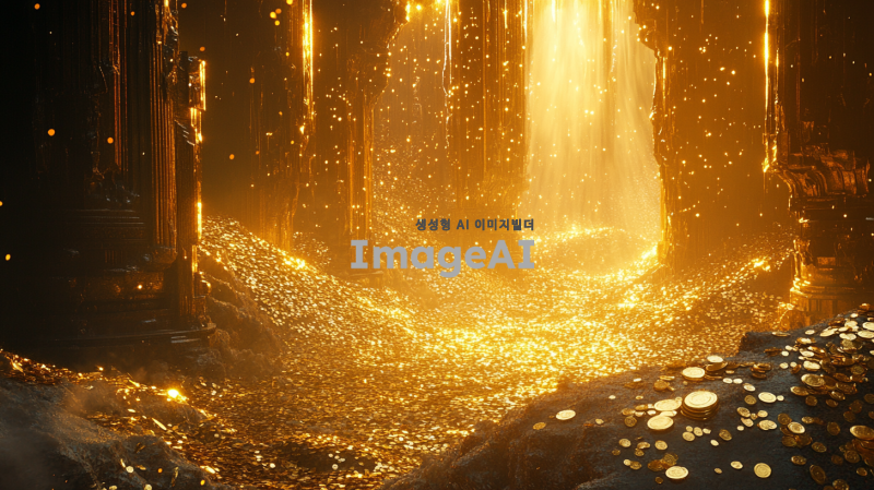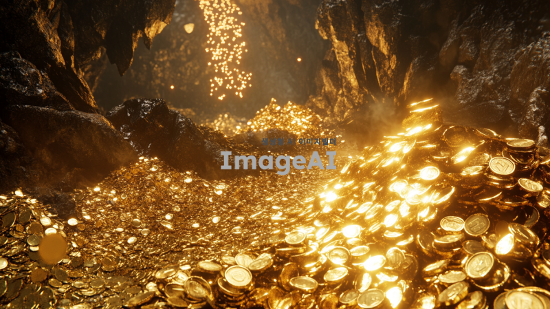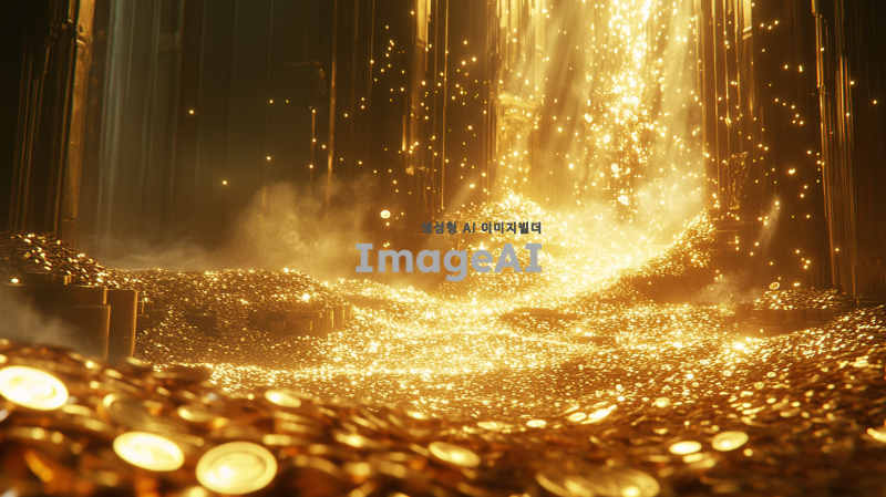 금이 넘칠 듯이 쌓여 있는 장면, 반짝거리는 금과 금화가 끝없이 쌓여 있으며 환하고 밝은 빛을 발하고 있는 모습. 주변은 온통 금으로 뒤덮여 있고, 작은 금화들이 쏟아지고 있으며, 옆에도 금이 한가득 쌓여 빛나는 모습.