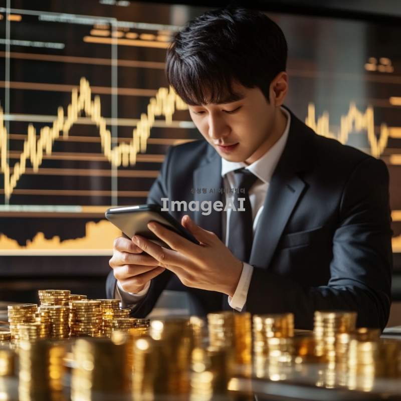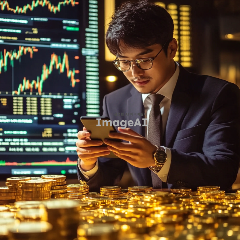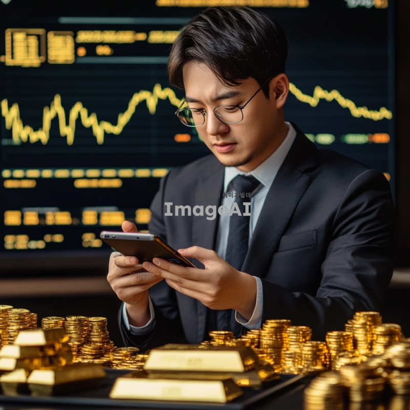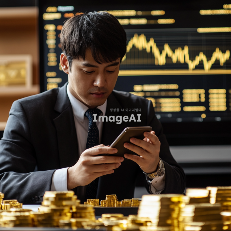 금색의 ETF 펀드 그래프가 배경으로 펼쳐져 있고, 중앙에는 한국인 남성이 스마트폰을 들고 투자 관련 데이터를 분석하고 있는 모습. 남성은 정장 차림이며, 주변에는 금괴와 동전들이 배열되어 있어 금 투자에 대한 이미지를 강조. 화면에는 차트와 숫자들이 표시되어 있어 금융 시장의 역동성을 나타내고, 전체적으로 전문적이고 신뢰감 있는 분위기를 연출.