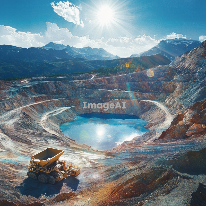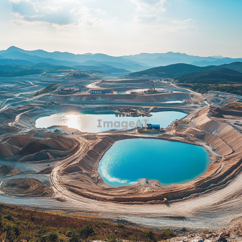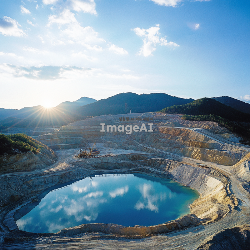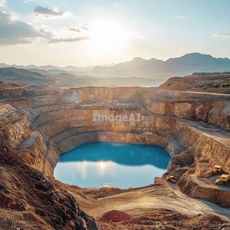 구리와 리튬 원자재의 특성을 강조한 이미지, 자연 환경 속에서 채굴되는 구리 광산과 리튬 염수 호수의 풍경, 태양광 아래 반짝이는 구리 광석과 푸른 리튬 염수의 대비, 현대적인 채굴 장비가 작업 중인 모습, 한국의 전통적인 요소를 가미하여 구리와 리튬의 중요성을 표현한 장면.