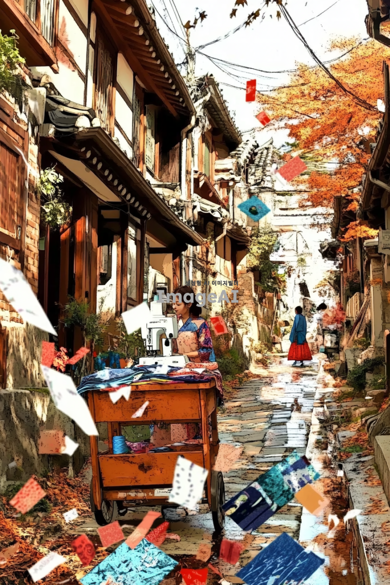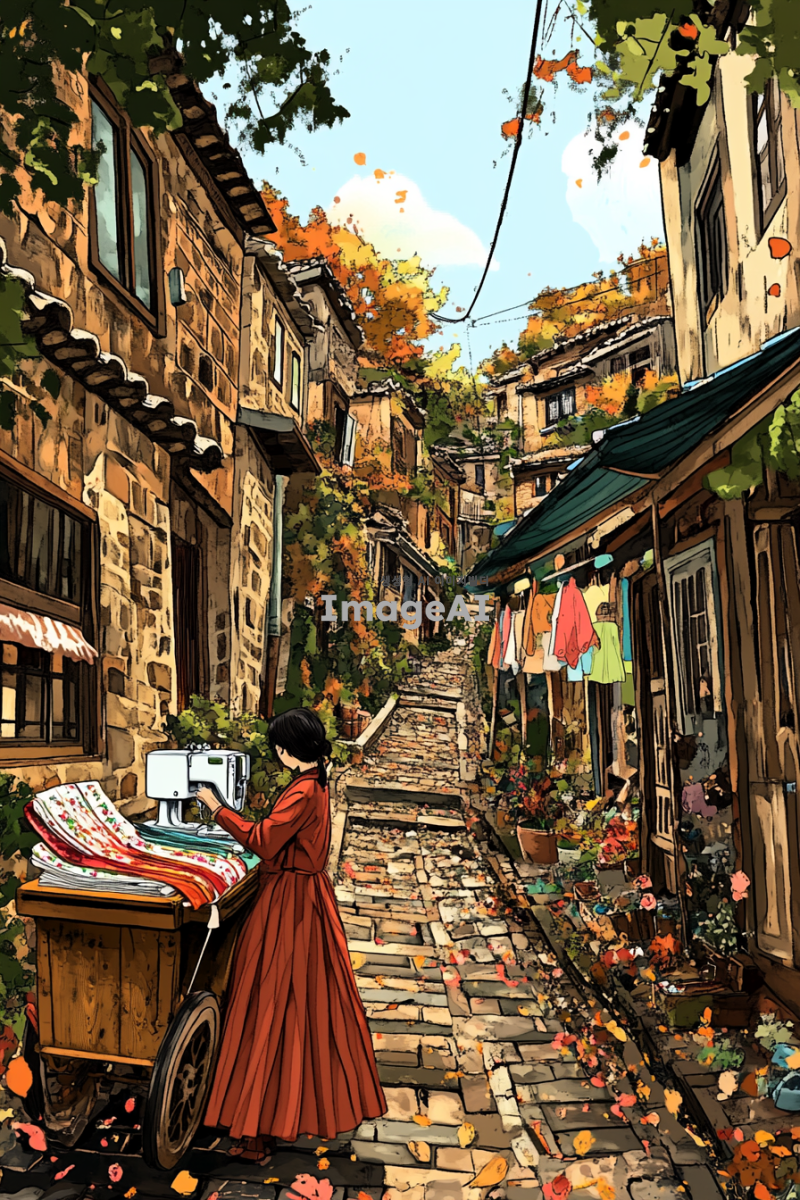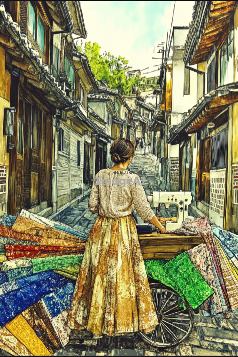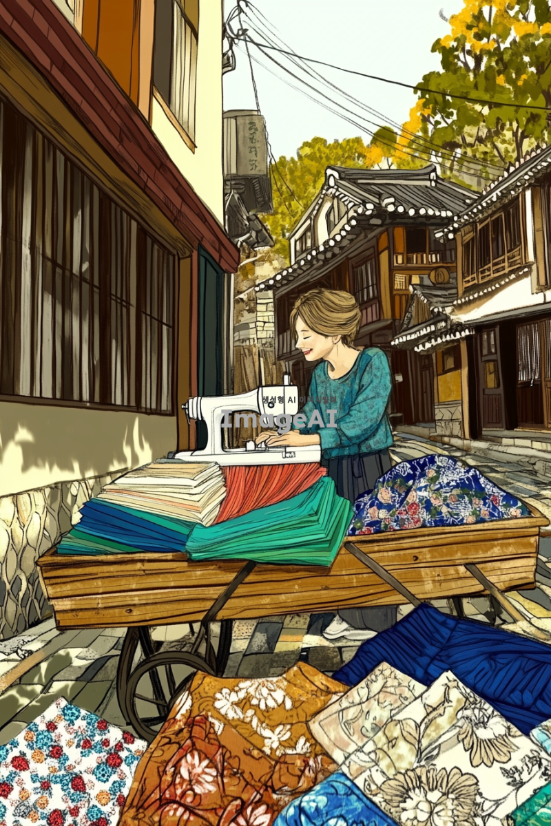재봉틀 마차가 있는 고풍스러운 거리 풍경, 아늑한 분위기의 작은 마을, 나무로 된 마차 위에 다양한 색상의 천과 실이 놓여져 있는 모습, 따뜻한 햇살 아래에서 재봉틀을 사용하는 한국인 여성, 배경에는 전통적인 한국 가옥과 푸르른 나무들이 어우러진 풍경, 세밀한 디테일과 따뜻한 색감으로 표현된 이미지.