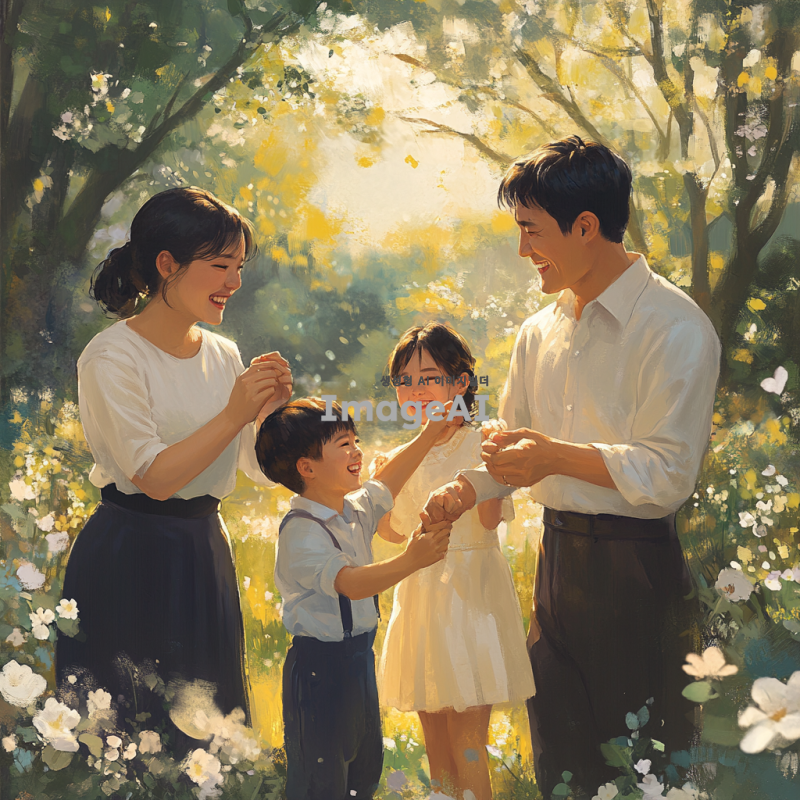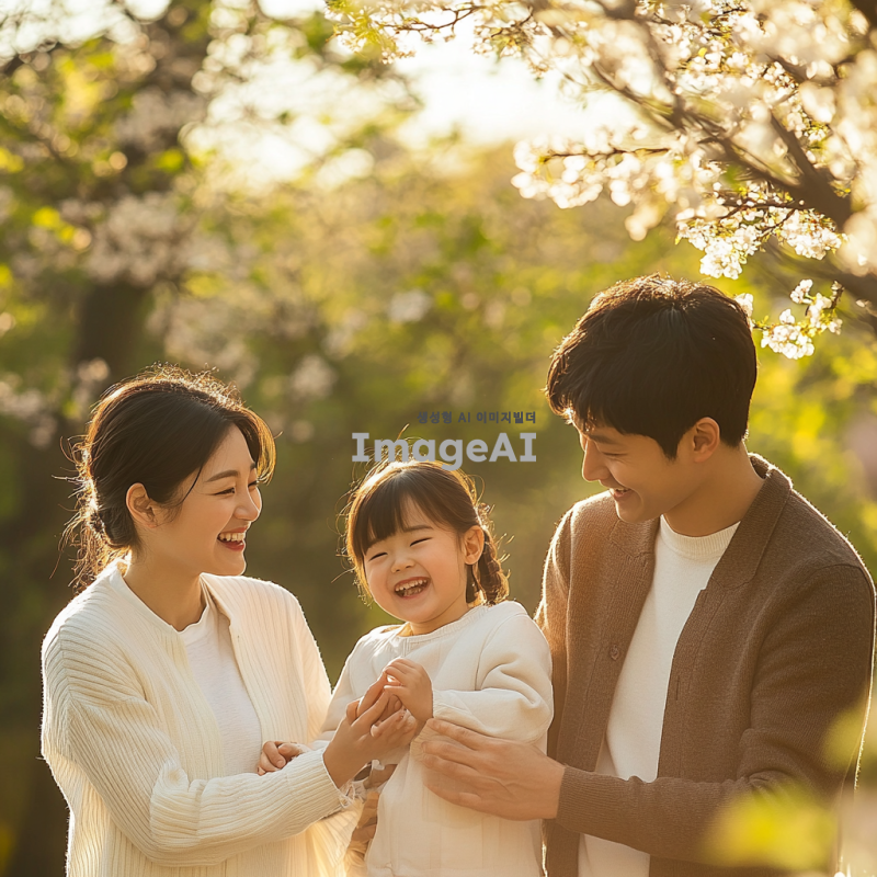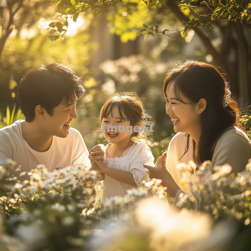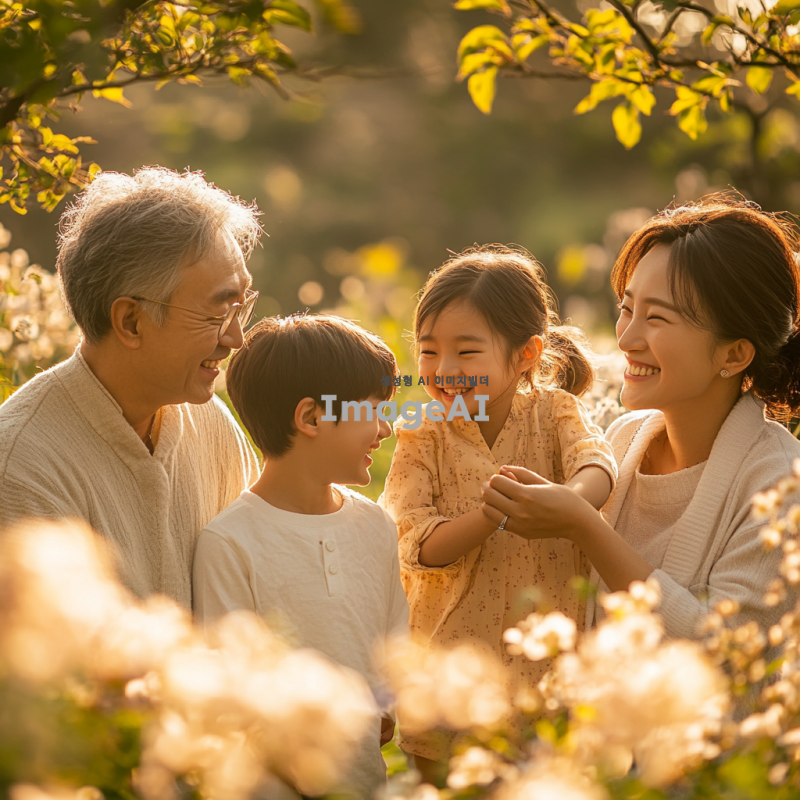행복한 순간을 나누는 한국인 가족, 따뜻한 햇살 아래 공원에서 함께 웃고 있는 모습, 서로의 손을 잡고 있는 장면, 주변에 피어나는 꽃들과 푸른 나무들, 행복한 표정과 따뜻한 분위기, 서로를 바라보며 미소 짓는 모습.
