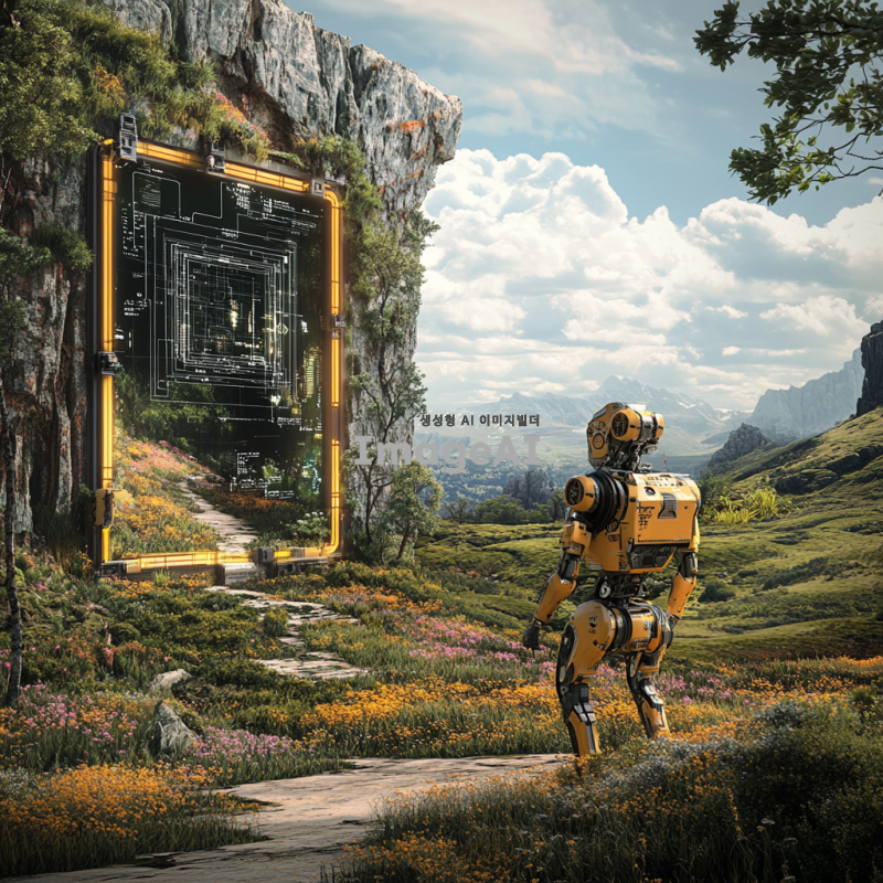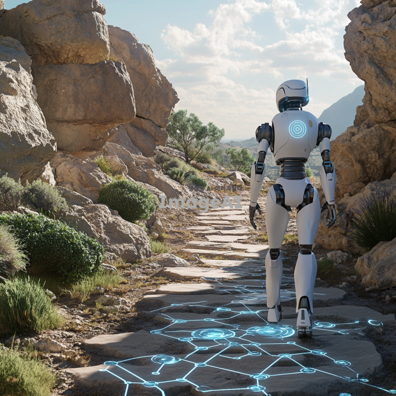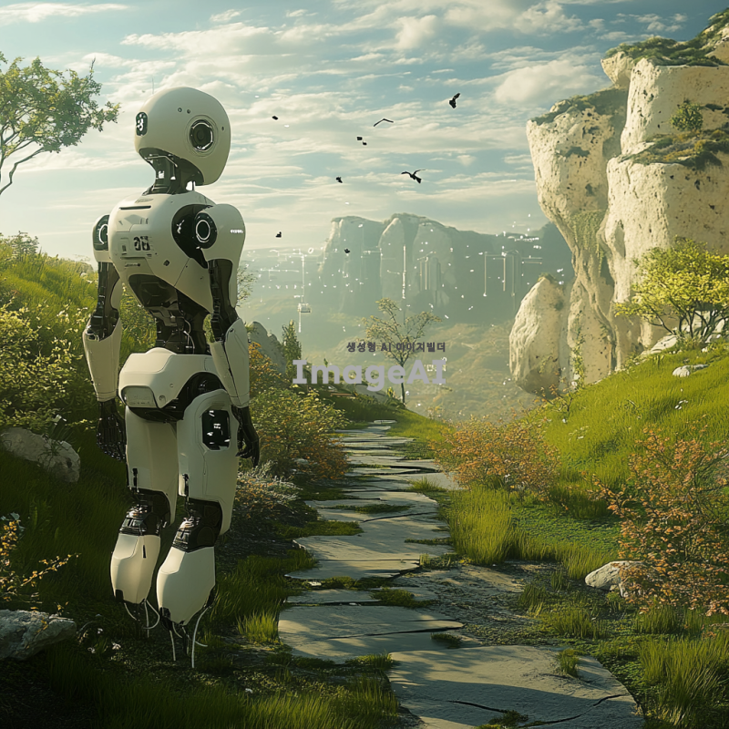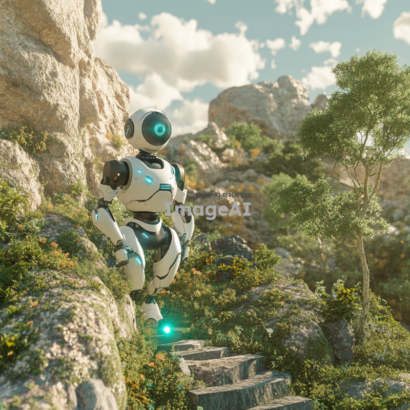 로봇이 장애물을 만나 새로운 경로를 탐색하는 장면, 복잡한 지형 속에서 장애물을 피하며 경로를 찾는 로봇의 모습, 다양한 센서를 활용해 주변 환경을 분석하는 모습, 현대적인 디자인의 로봇과 자연 풍경의 조화, 알고리즘을 설명하기 위한 시각적 요소가 포함된 이미지.