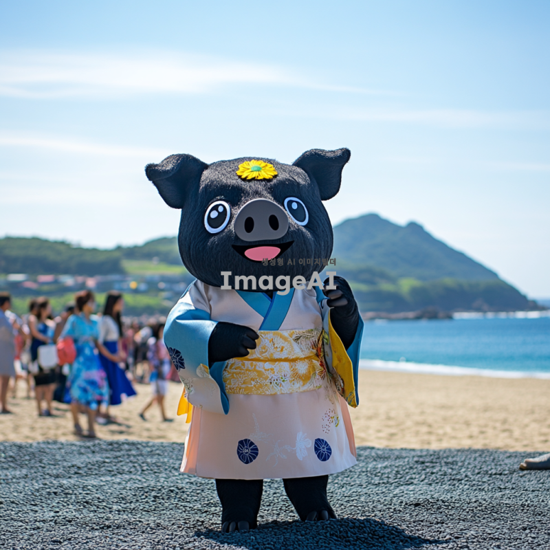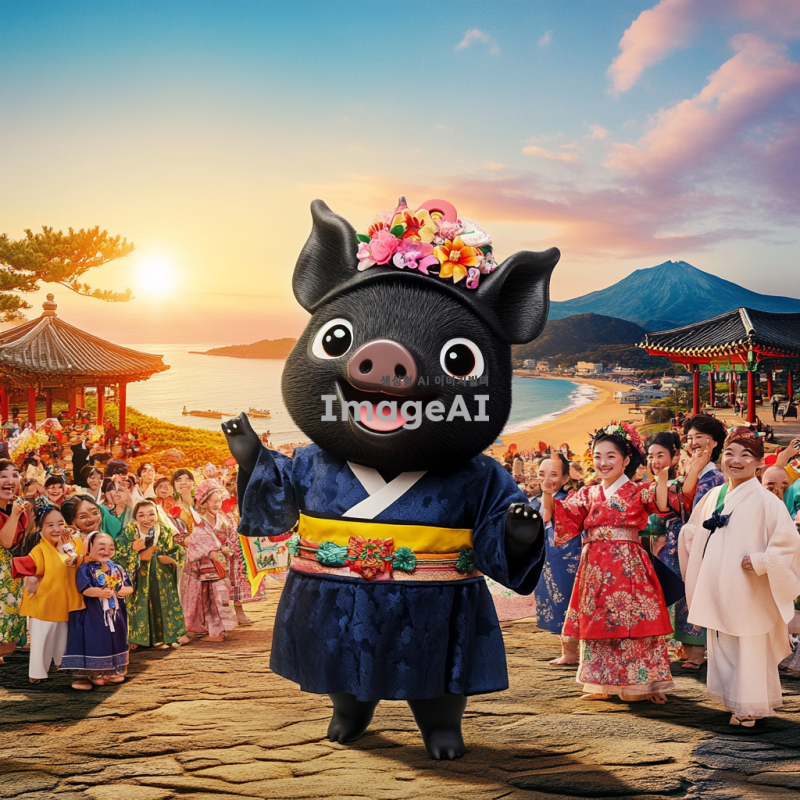 제주흑돼지를 글로벌 캐릭터로 표현한 이미지, 귀엽고 친근한 표정의 제주흑돼지가 세계 여러 나라의 전통 의상을 입고 다양한 문화 아이콘과 함께 있는 모습, 배경에는 제주도의 아름다운 자연 경관이 펼쳐져 있고, 해변과 한라산이 보이는 풍경, 따뜻한 햇살 아래에서 즐거운 분위기를 연출, 다양한 인종의 사람들과 함께 행복하게 어울리는 모습