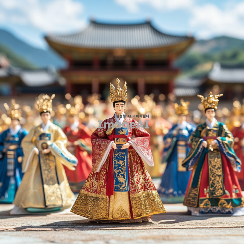 신라 시대의 궁궐을 배경으로 한 한국 전통 복장을 입은 인물들, 화려한 금관과 화려한 장신구로 장식된 모습, 고대 신라의 건축 양식이 드러나는 궁전과 주변 경관, 푸른 하늘과 함께하는 아름다운 자연 풍경, 전통적인 신라의 일상 생활을 담은 장면.
