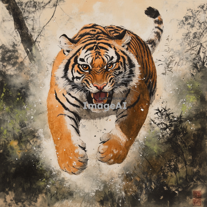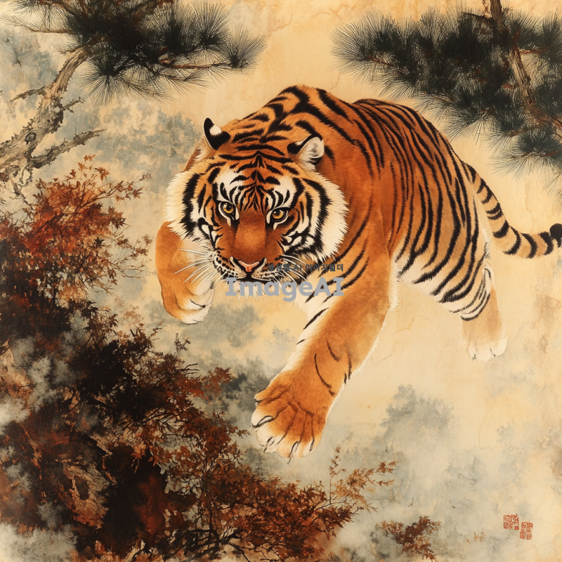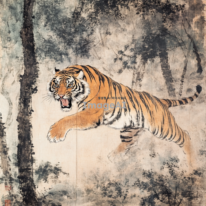 동양화 스타일의 호랑이, 전통적인 한국의 화풍으로 표현된 호랑이가 숲속에서 힘차게 뛰어오르는 모습, 생동감 넘치는 색채와 섬세한 붓 터치, 자연과 조화롭게 어우러진 배경, 고요한 분위기 속에서 강렬한 호랑이의 눈빛이 돋보이는 장면.