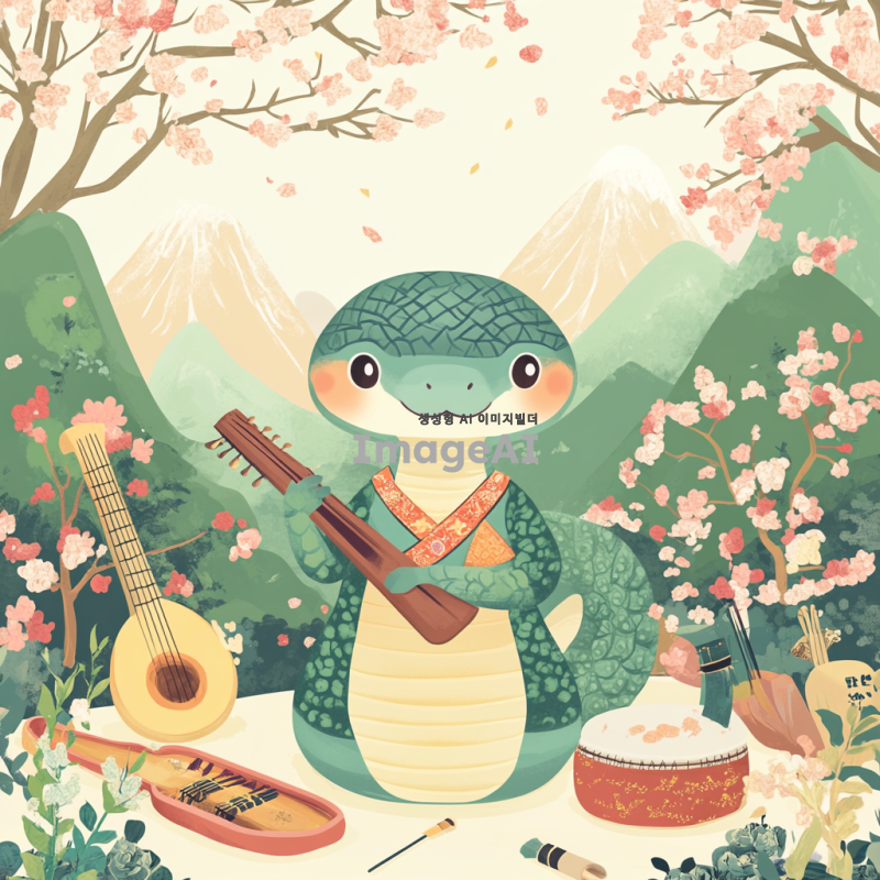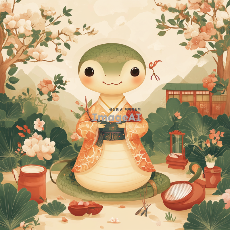 귀여운 뱀이 전통 한복을 입고 판소리를 하고 있는 모습, 뱀의 표정은 즐겁고 생동감 넘치며, 배경은 한국의 전통 정원으로, 아름다운 꽃들과 나무들이 어우러져 있는 장면. 뱀의 몸은 유려한 곡선으로 표현되고, 판소리의 전통 악기들이 주변에 배치되어 있는 모습.