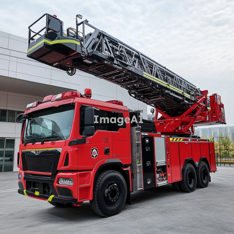 한국 사다리차의 현대적인 디자인이 조화를 이루며, 옆에서 본 모습이 였으면 좋겠고 애니매이션화 해줘