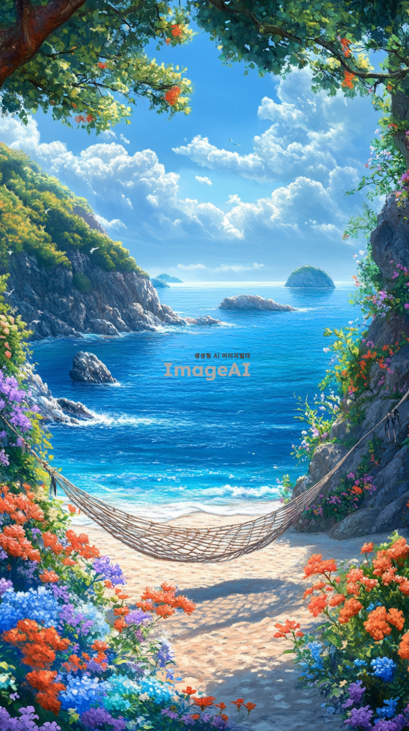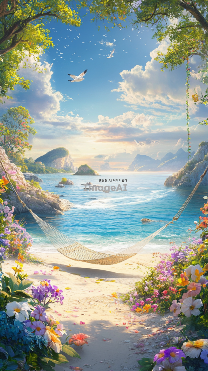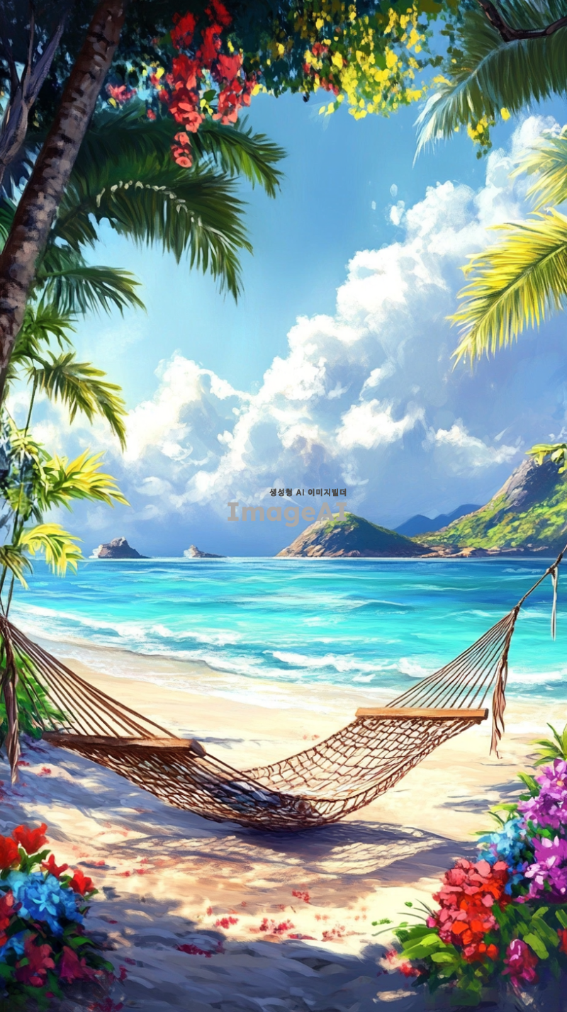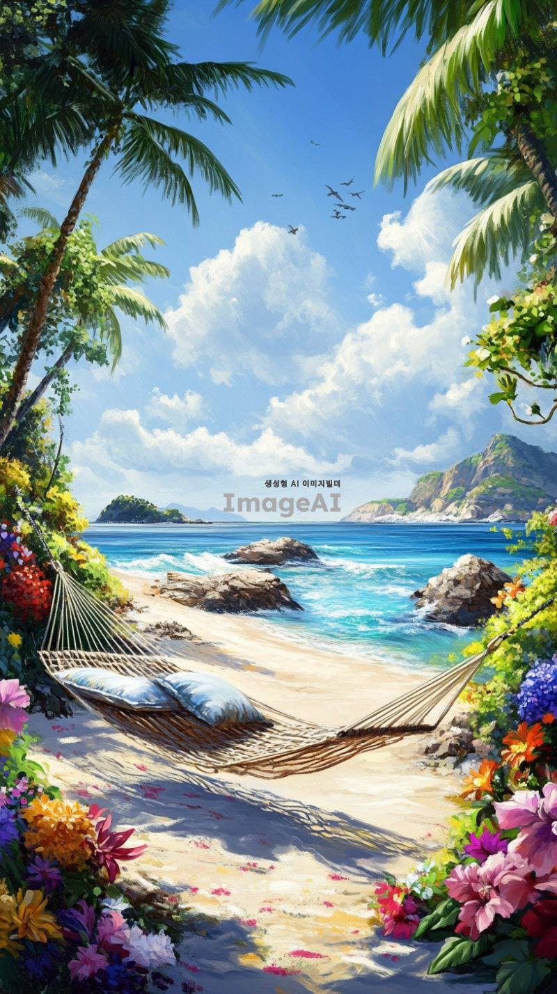 푸른 바다와 하늘이 어우러진 평화로운 풍경, 해변에 놓인 아늑한 해먹과 그 주변에 피어 있는 다양한 색상의 꽃들, 멀리 보이는 섬과 부드러운 파도, 따뜻한 햇살이 비추는 따뜻한 느낌의 장면, 자연의 아름다움과 편안함을 강조하여 시각적으로 매력적인 배경화면.