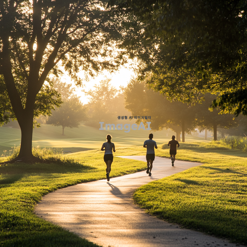 새벽에 라이트 조명을 받으면서 골프장 카트길을 달리는 사람들. 계절은 여름.