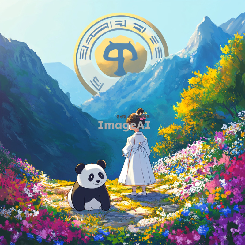 한국의 아름다운 자연 풍경 속에서 귀여운 판다와 함께하는 어린 소녀, 소녀는 전통 한복을 입고 있으며, 주변에는 화려한 꽃들과 나무들이 가득하다. 따뜻한 햇살이 비추고, 배경에는 신비로운 산들이 보인다. 전체적인 분위기는 몽환적이고 동화 같은 느낌을 주며, 지브리 애니메이션 스타일로 그려진다.