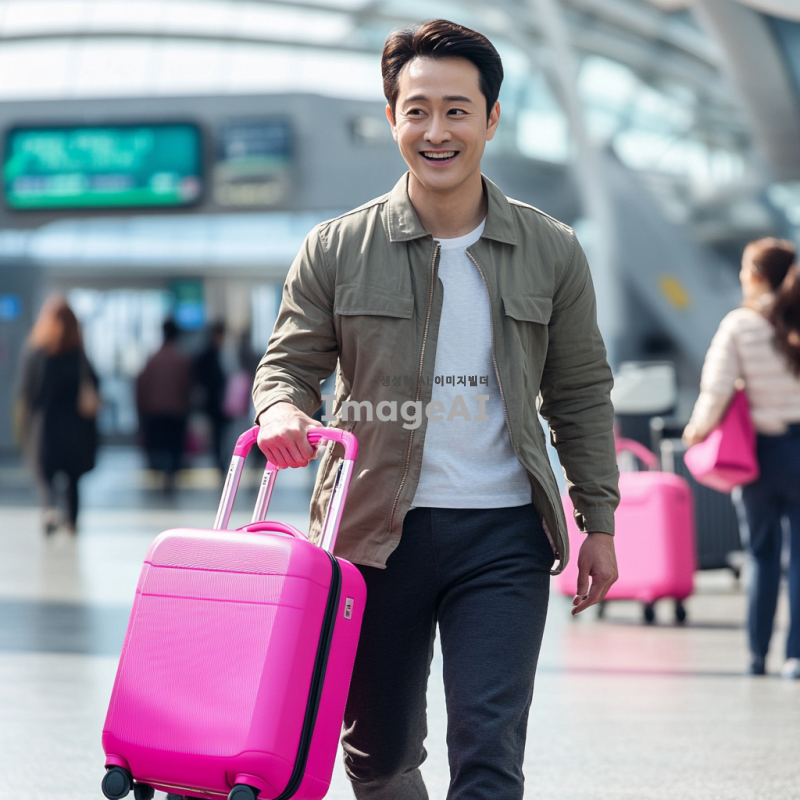 35살의 한국 남성이 핑크색 캐리어를 끌고 있는 모습. 남자는 캐주얼한 복장을 하고 있으며, 배경은 공항의 출발 구역. 주변에는 여행 가방과 사람들로 북적이는 분위기. 남자의 표정은 즐거워 보이며, 햇빛이 비치는 날씨.