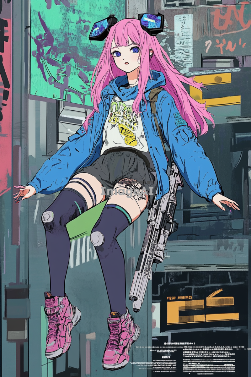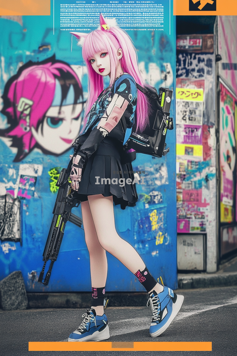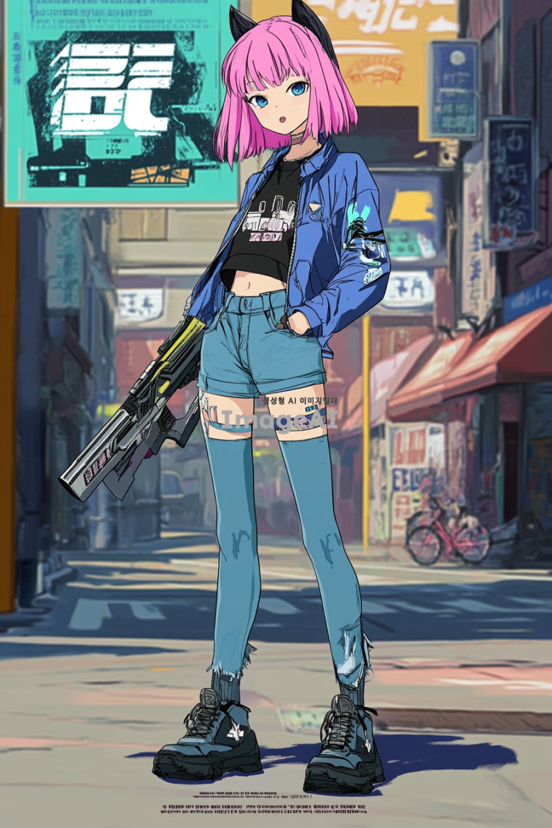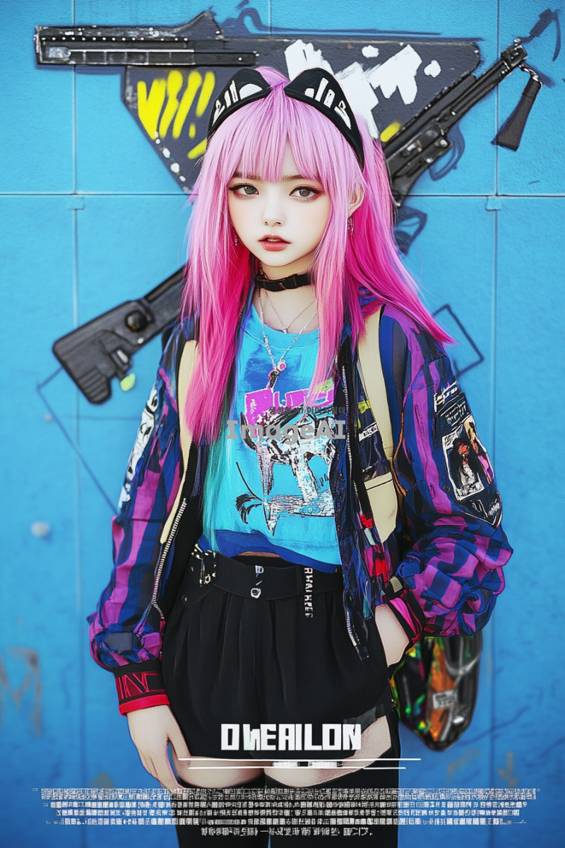 블루아카이브 스타일의 핑크머리 캐릭터, 서브컬쳐 풍의 배경, 화려한 색감과 독특한 패션, 귀여운 표정과 생동감 넘치는 포즈, 일본 애니메이션 스타일의 세밀한 묘사, 도시의 거리 풍경을 배경으로 한 모습.