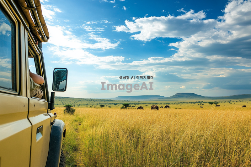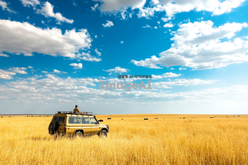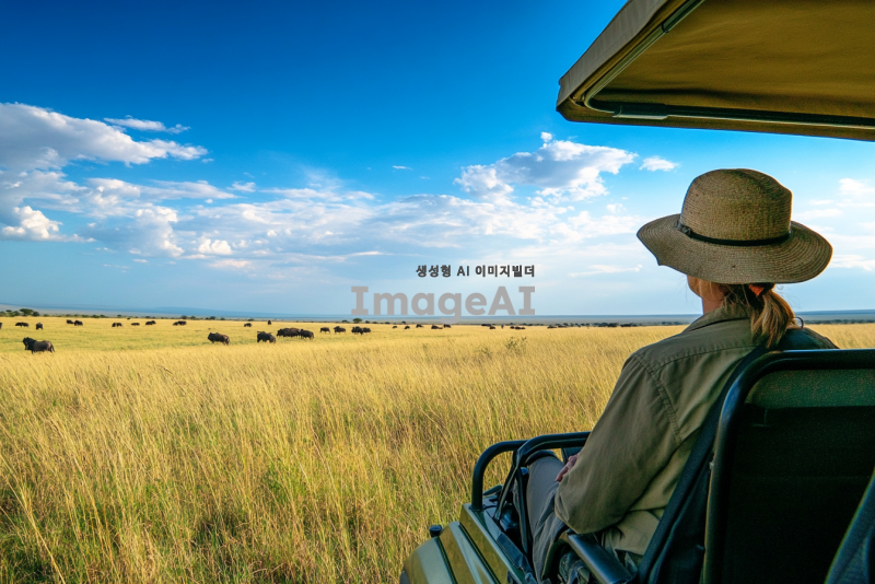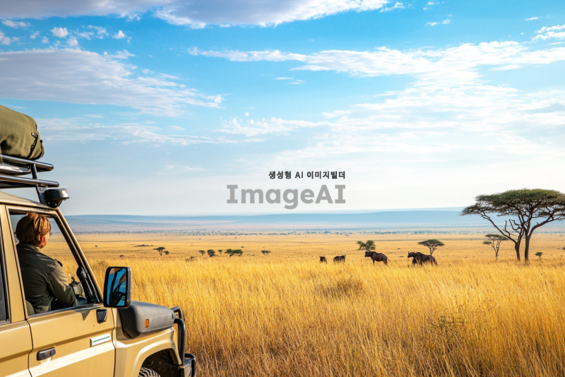 세렝게티 국립공원에서의 게임 드라이브, 다양한 야생동물들이 자유롭게 뛰노는 광활한 초원, 푸른 하늘 아래 펼쳐진 드넓은 풍경, 한국인 관광객이 사파리 차량에 앉아 야생동물을 관찰하는 모습, 따뜻한 햇살과 함께 생동감 넘치는 자연의 아름다움, 동물들의 생생한 모습과 그들의 서식지.